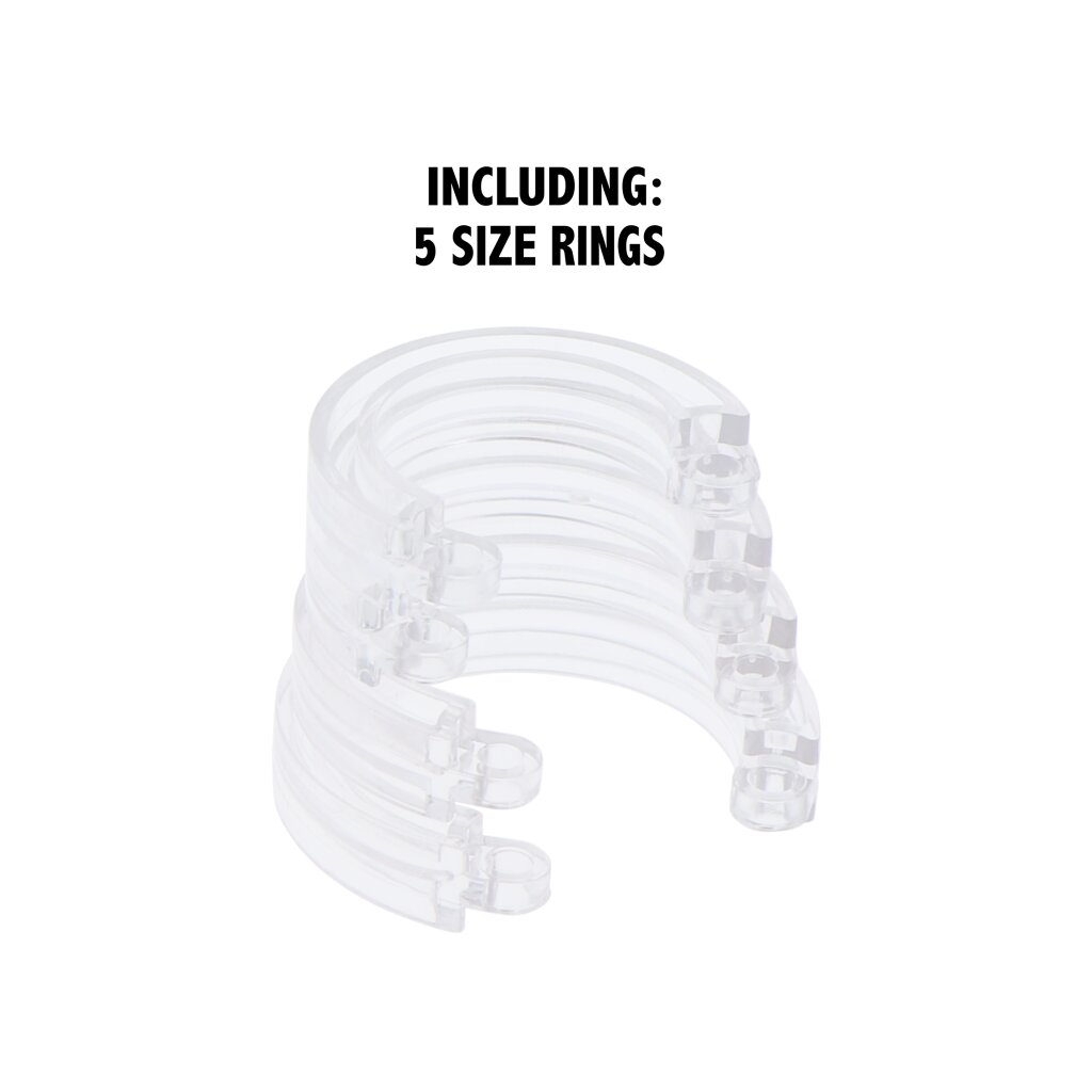 Avec ses 11 cm de longueur totale et 8 cm insérables, elle s’adapte parfaitement grâce à cinq anneaux interchangeables (3,5 cm, 3,8 cm, 4,2 cm, 4,5 cm et 4,8 cm). Le set comprend également des broches et des tubes de rechange pour un ajustement optimal. La cage peut être verrouillée à l’aide du cadenas fourni ou de scellés numérotés, parfaits pour les jeux de chasteté ou de domination.