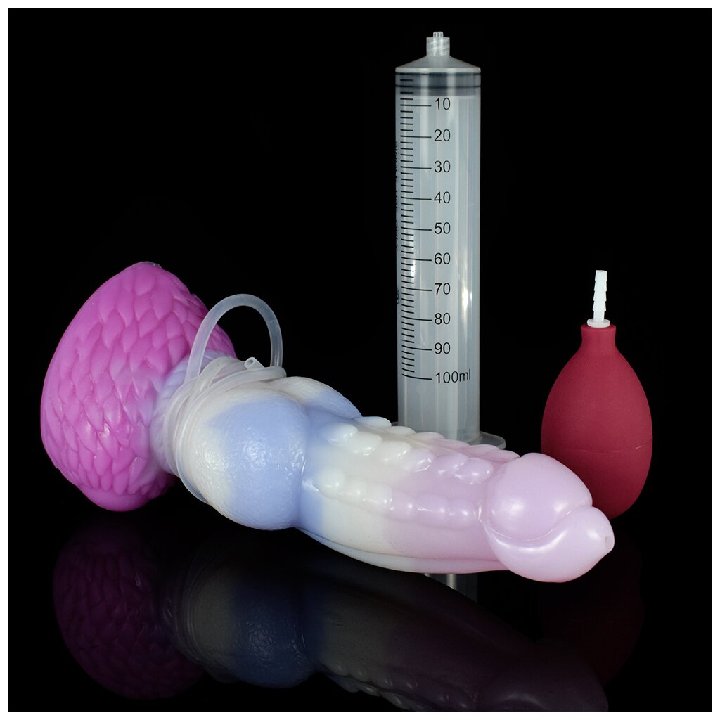 Le godemiché est creux à l'intérieur, ce qui permet de le remplir avec n'importe quel liquide. Le sperme artificiel pénètre dans le godemiché par un tuyau et peut ensuite être éjecté. Grâce à une balle-pompe ou une seringue, le jus est injecté en toi ou là où tu le souhaites.