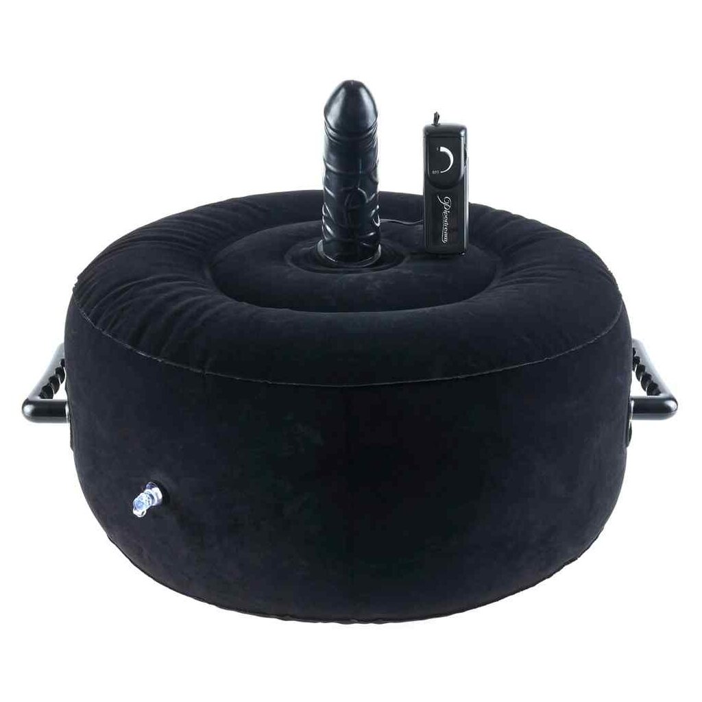 Inflatable sex cushion with an integrated vibrator in a penis shape. The vibrator also has pronounced veins as well. The sturdy handles provide support when the user is moving up and down. The variable multi-speed vibration can be adjusted fron gentle to hard with the remote control on a wire. The cushion is covered in a washable, skin-friendly flocked cover that is in a velvet look. The cushion can be inflated and deflated really easily because of the air-seal valve. (Please order batteries separately: 2 x AA).