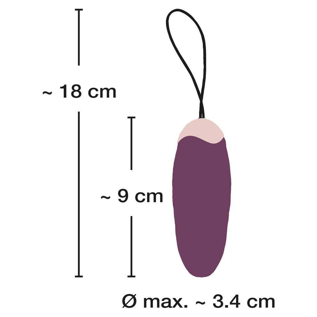 Total length 18 cm. Vibro egg 9 cm long, Ø 3.4 cm. Weight 98 g. Silicone, PU, ABS.