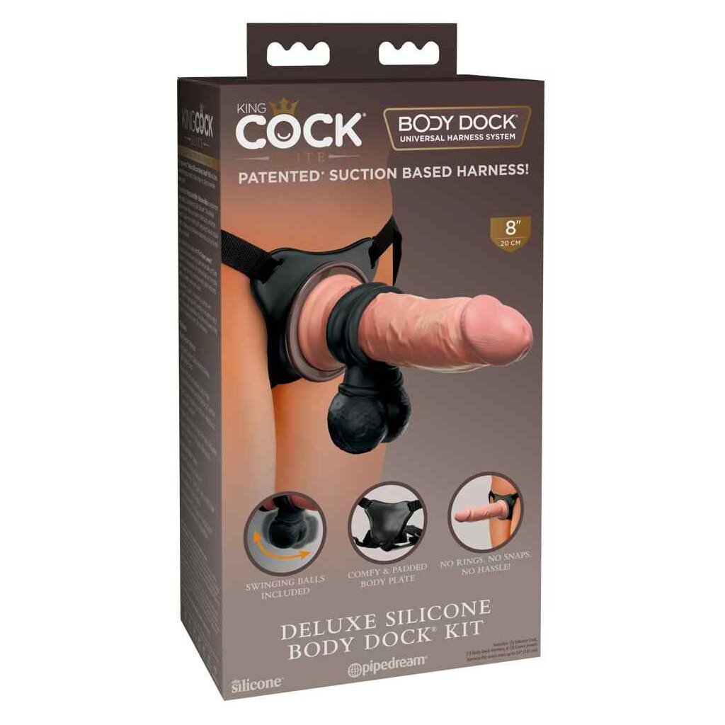 The Deluxe Silicone Body Dock Kit from King Cock Elite includes the comfortable strap-on Comfy Body Dock, the very realistic 8" Dual Density Silicone Cock natural dildo, and the penis ring with weighty Swinging Crown Jewels testicles.