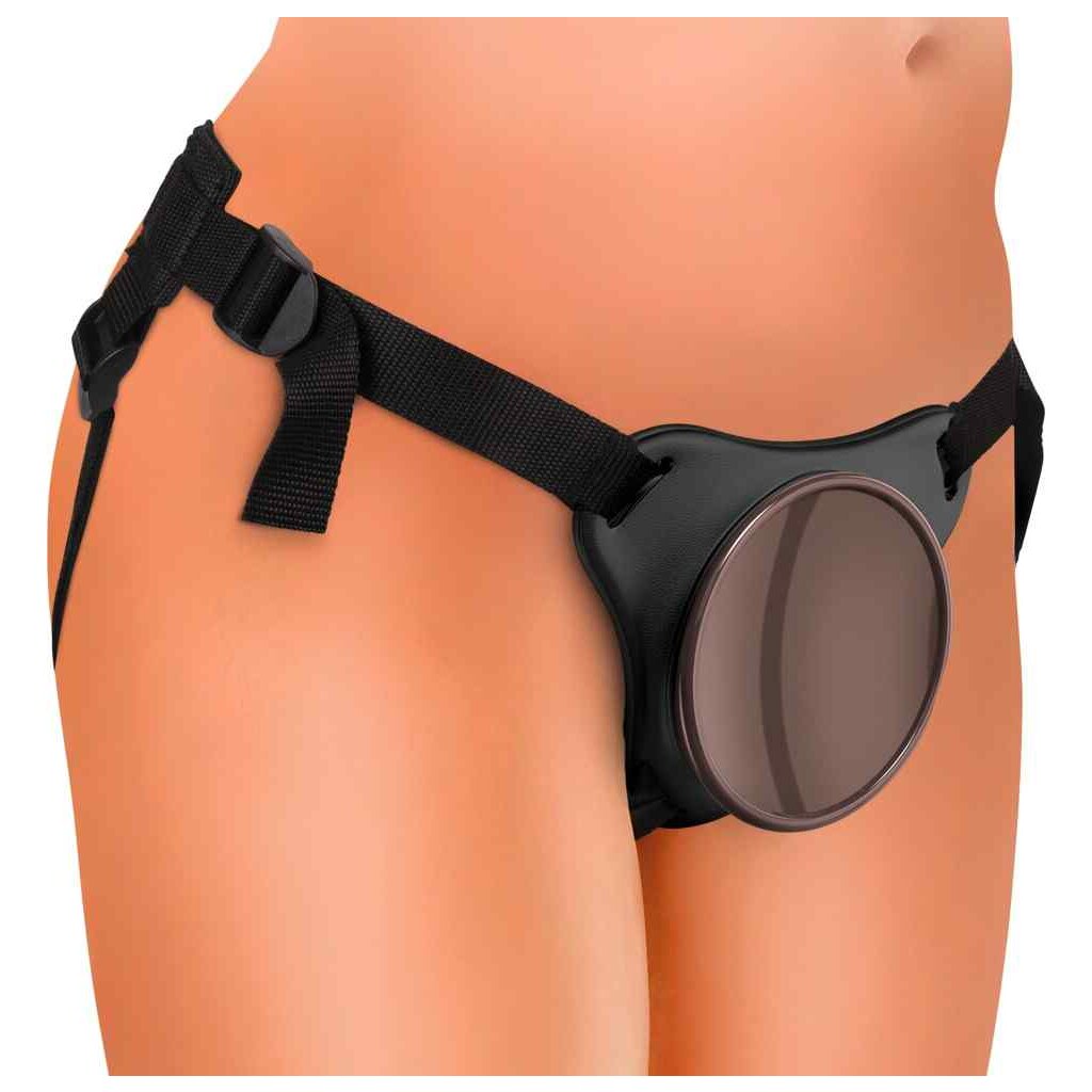 The simple strap-on system is based on the anatomically curved body plate with docking recess, in which the suction base of the dildo is fixed/docked bomb-proof and holds it in a shock-ready position (Push and Play). The soft padded body plate distributes the pressure evenly over the pelvic area, so that punctual uncomfortable pressure is avoided. The sturdy wide straps are adjustable in fit with plastic sliders for a firm and comfortable fit. It is also possible to fix any other conventional suction base vibrator/dildo to/in the body dock.