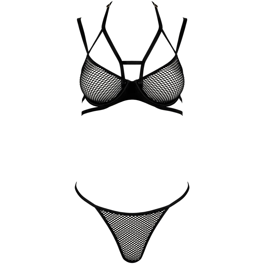 This exciting lingerie set combines seductive design with comfortable wearability. The halterneck bra is made from coarse mesh and offers tantalizing glimpses, while the elastic material feels soft and gentle against the skin. Adjustable straps ensure a personalized fit and perfectly highlight the décolleté.