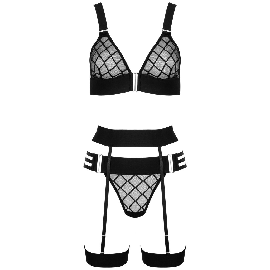 Cette combinaison extravagante composée d'un soutien-gorge souple, d'un string et d'une large ceinture avec des lanières amovibles pour les cuisses ne manquera pas d'attirer tous les regards. Le motif en losanges accrocheur en maille semi-transparente ajoute une touche moderne et sensuelle. Le soutien-gorge avec bonnets triangulaires sculptants assure un décolleté naturellement Beau.