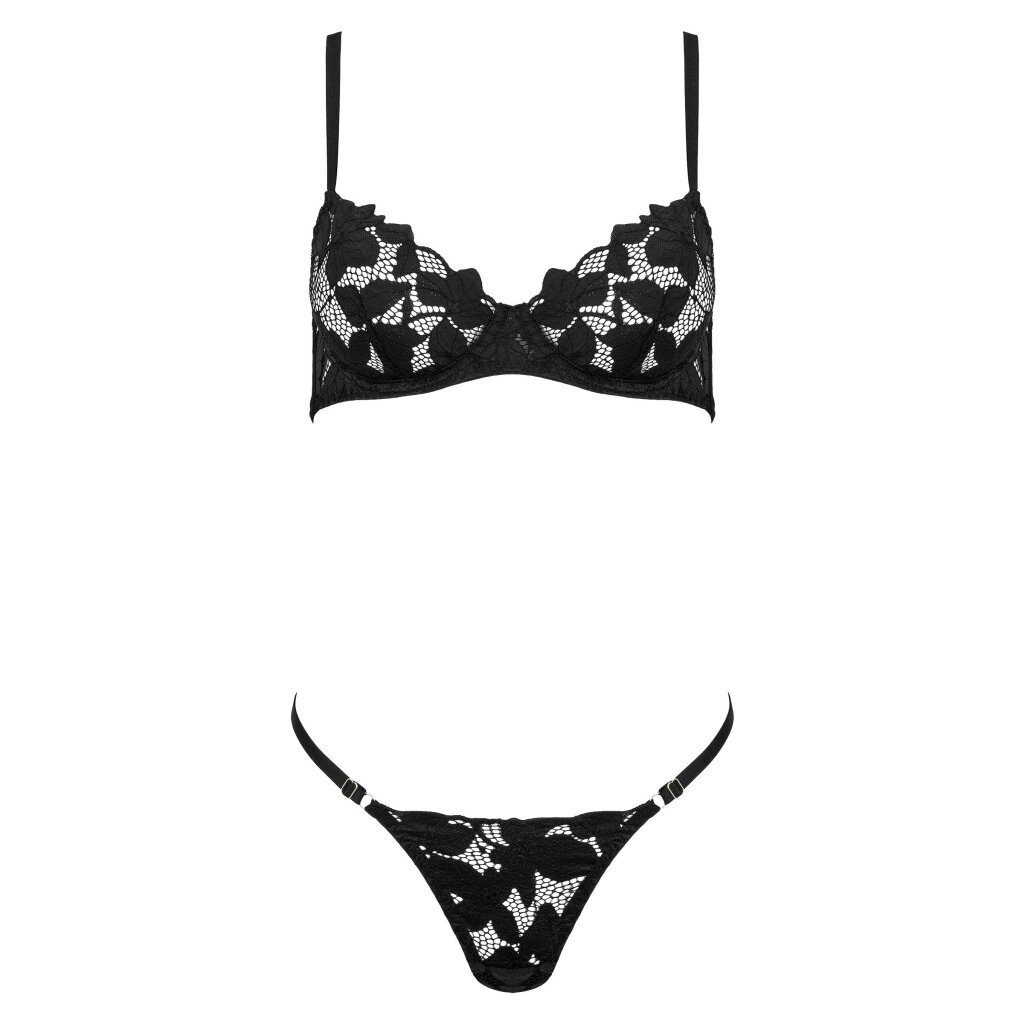 Dentelle délicate, bretelles fines et coupe minimaliste : cet ensemble deux pièces allie élégance classique et touches modernes. Le soutien-gorge à armatures est doté de bonnets en dentelle semi-transparente qui soulignent la poitrine tout en restant légers et confortables. Le string assorti reprend le motif floral de la dentelle et met en valeur la silhouette féminine.
