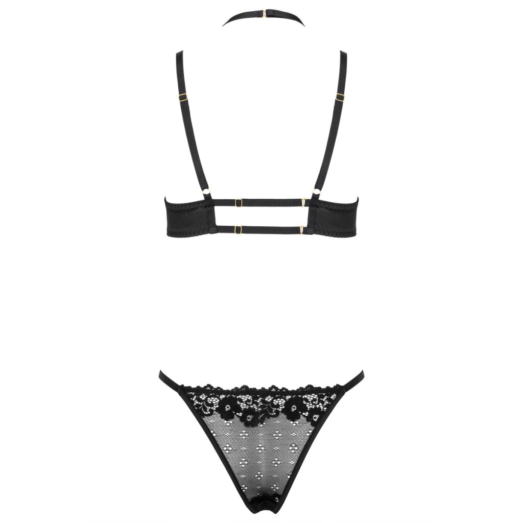 Dieses bezaubernde und verführerische Set vereint das Beste aus klassischem und modernem Design und lässt dich unglaublich feminin und sexy wirken. Gefertigt aus zarter Spitze und luxuriösem Satin in klassischem Schwarz unterstreicht es Deine natürliche Schönheit und sorgt für ein sinnliches Trägererlebnis Die Träger und der Neckholder-BH sind stufenlos verstellbar, während der verstellbare Verschluss im Rücken für eine optimale Passform sorgt. Die Bügel heben die Brust und betonen das Dekolleté. Die Spitze ist so konzipiert, dass sie einen dezenten Einblick gewährt und gleichzeitig einen hervorragenden Halt bietet. Zarte Spitze mit schönen Stickereien verleiht einen Hauch von Eleganz und unterstreicht die natürliche Schönheit deines Körpers. Der modern geschnittene String ist ebenfalls verstellbar und rundet das sinnliche Design dieses Sets perfekt ab.