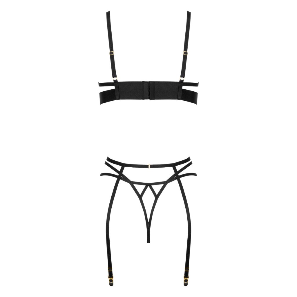 Cet ensemble de lingerie trois pièces époustouflant souligne la sensualité et la féminité et est composé d'une matière semblable au latex. Le soutien-gorge à armatures offre un excellent maintien et souligne la beauté naturelle des seins. Les bonnets souples s'adaptent parfaitement au corps et assurent un confort agréable. L'arrière du soutien-gorge est muni d'une fermeture réglable à 3 crochets, les bretelles sont réglables individuellement. L'ensemble comprend un porte-jarretelles sensuel qui souligne la taille et confère de l'élégance à l'ensemble. Les jarretelles sont également réglables. L'ensemble est complété par un string chic qui met joliment les fesses en valeur. Cet ensemble est idéal pour les femmes qui souhaitent affirmer leur confiance en elles et leur style unique.
