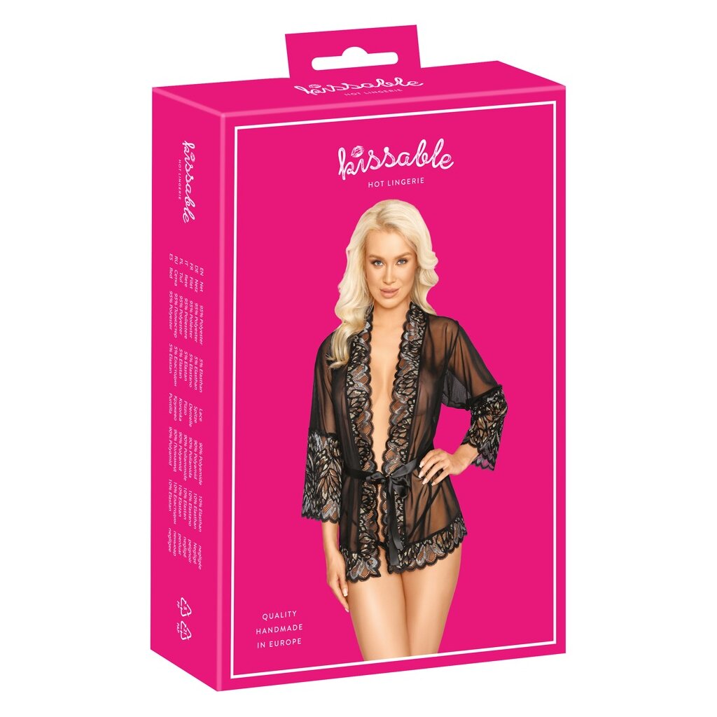 Short bum-covering kimono by kissable made of fine powernet mixed with precious effect lace. All around soft and elastic for highest wearing comfort. With 3/4 sleeves and satin tie belt.
