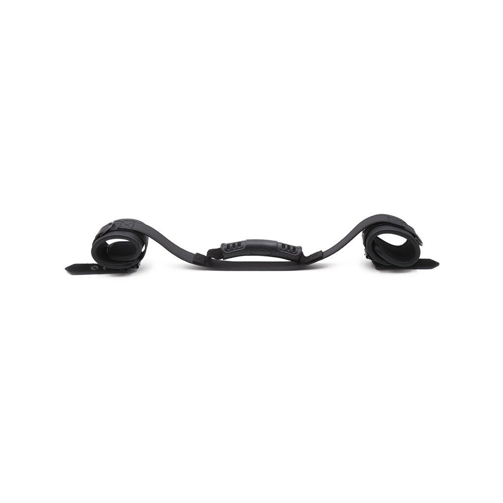 • These black handcuffs are paired with a handle that connects the two handcuffs.