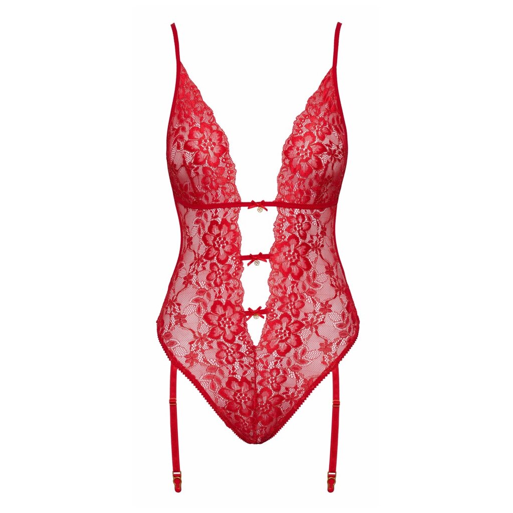 Seductive suspender bodysuit by kissable made entirely from fine red lace with gold-coloured highlights and details. Soft and elasticated all over for maximum comfort. Cut low at the front down to the waist, the 3 connecting straps are decorated with bows and glittering stones in the centre. Two-piece look at the back (bra & suspender briefs). Small hook fastener at the back. The straps and suspender straps are adjustable.