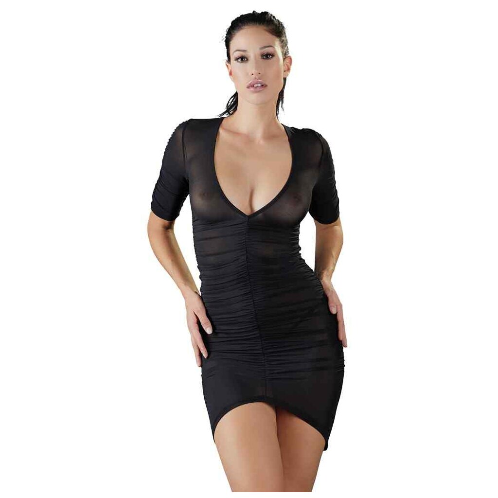 Effektvoll gerafft zur perfekten Kurvenbetonung! Figurbetonendes Halbarm-Minikleid in semi-transparentem Schwarz mit effektvoller Raffung vorne und hinten. Dadurch ist der Saum vorne etwas kürzer als seitlich und hinten. Vorne extra tief in V-Form ausgeschnitten. Weich und hochelastisch für hohen Tragekomfort.