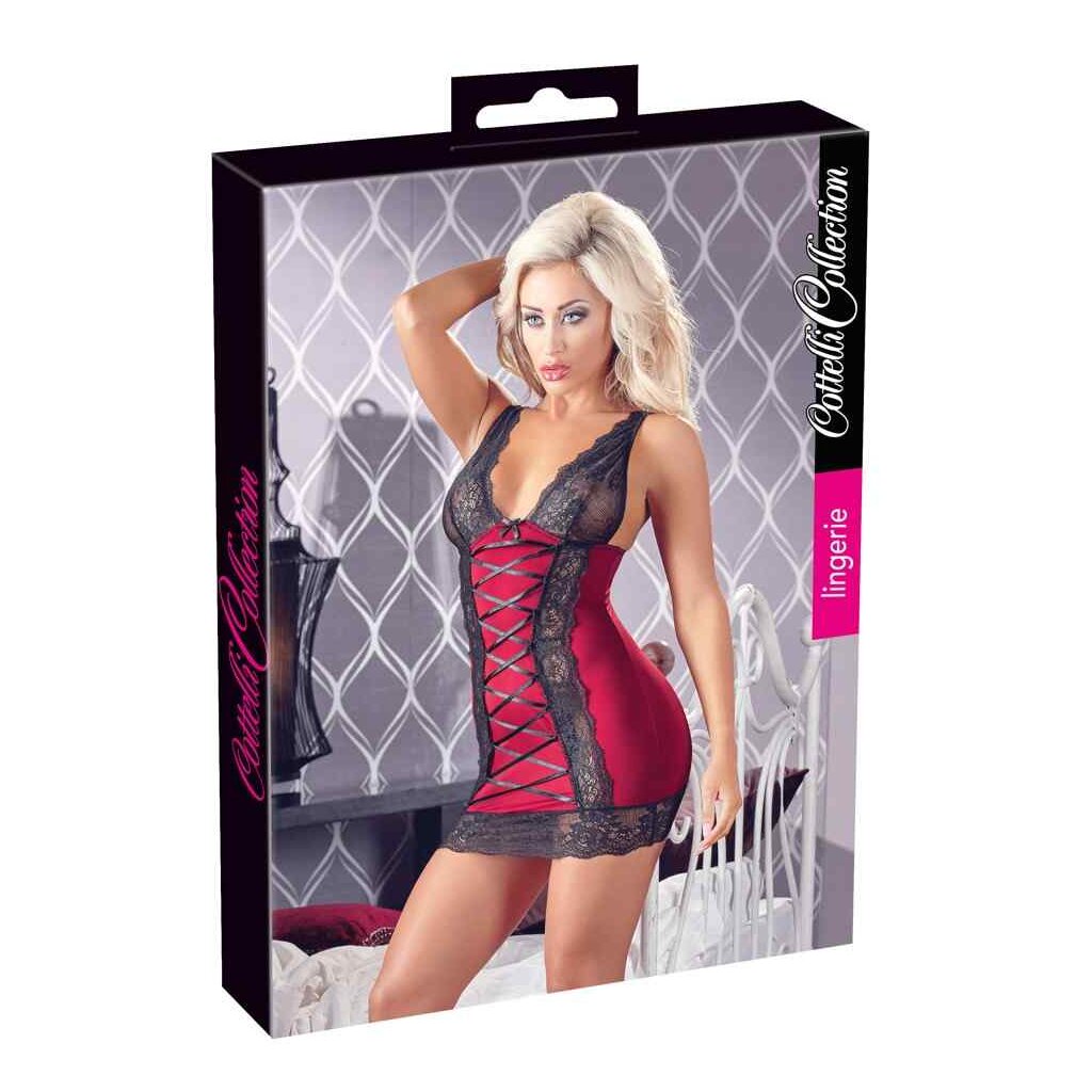 Oh là là! Red chemise with decorative lacing at the front. Beautiful lace inserts in the cleavage area, stomach and hem add the finishing touch to this sexy look. With adjustable straps.