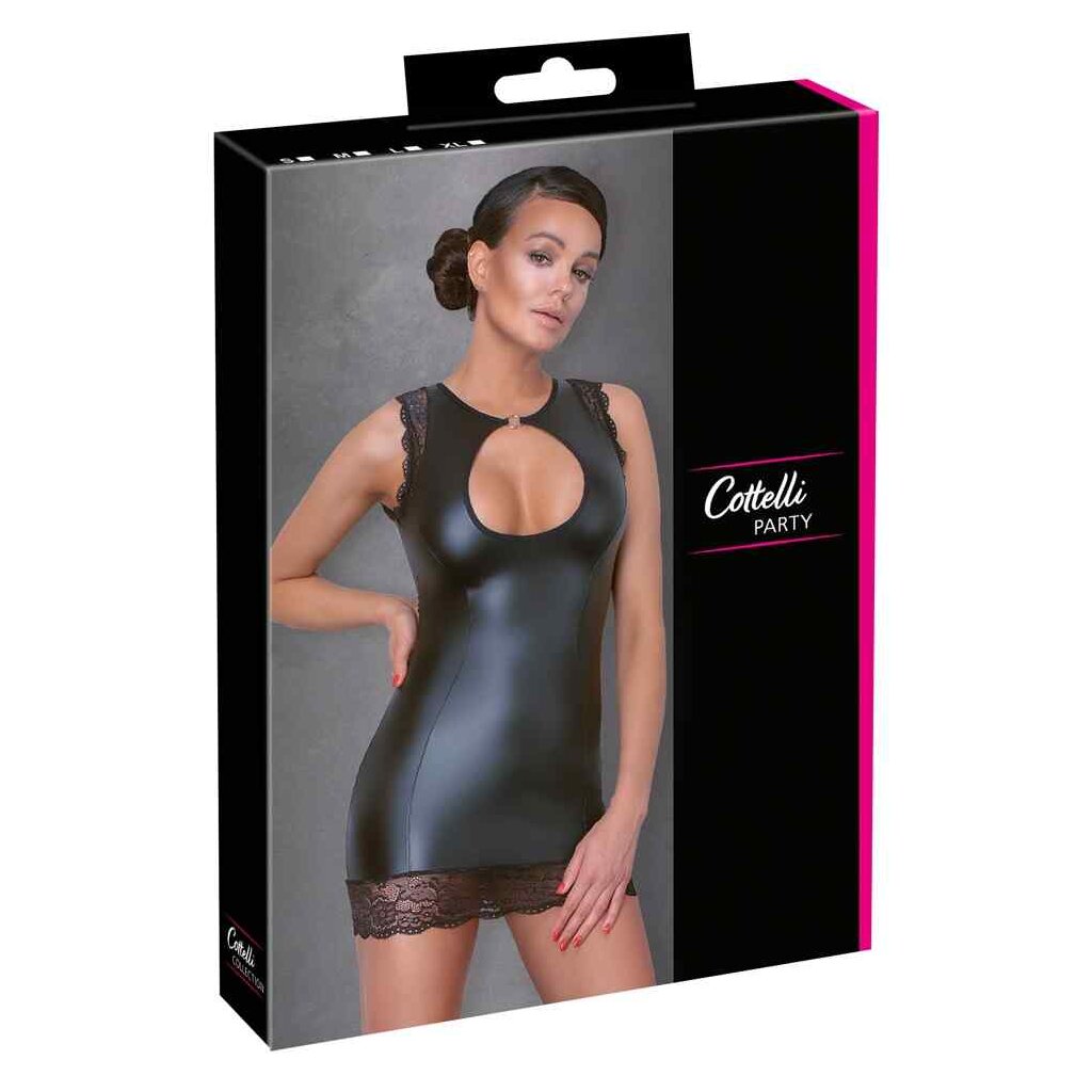 Eng geschnittenes kurzes Kleid von Cottelli PARTY im schwarzen Mattlook mit zarter Spitze an den Armausschnitten und am Saum. Mit großem runden Ausschnitt über dem Dekolleté und im oberem Rücken, vorne mit dekorativem Ring, im Nacken mit Clipverschluss. Weich und hochelastisch für hohen Tragekomfort.