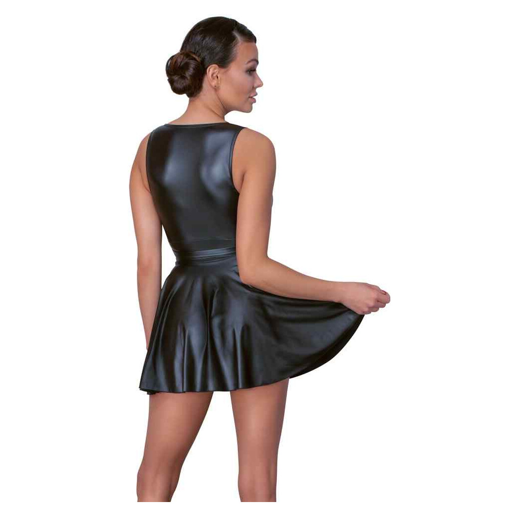 La robe courte de Cottelli PARTY est fabriquée dans une matière d'aspect noir mat. La partie supérieure de la robe est moulante et la partie inférieure est une partie jupe évasée et chaloupée. Elle est très décolletée sur le devant. Il y a également une ceinture réglable à la taille avec deux anneaux. Douce et extensible pour un ajustement confortable.