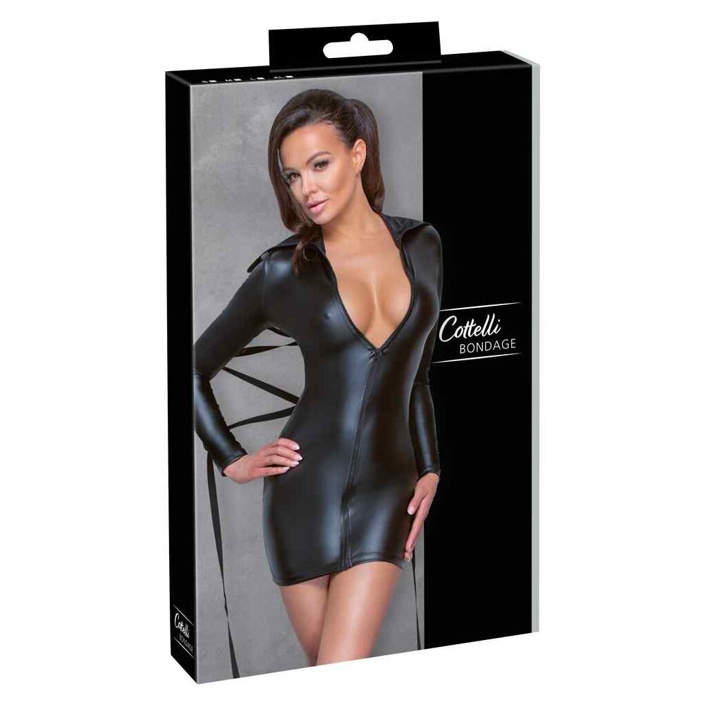 Elastic long-sleeved dress by Cottelli BONDAGE in a tight figure-hugging cut in black noble matt look. With extravagant high collar up to over the nose, where also the front zipper begins and runs through to the hem - the dress can thus be opened completely. The long arms are equipped with a reinforced striped trim, in which 5 bondage rings are incorporated in each case. With enclosed bondage tape, the arms can thus be fixed on the back.