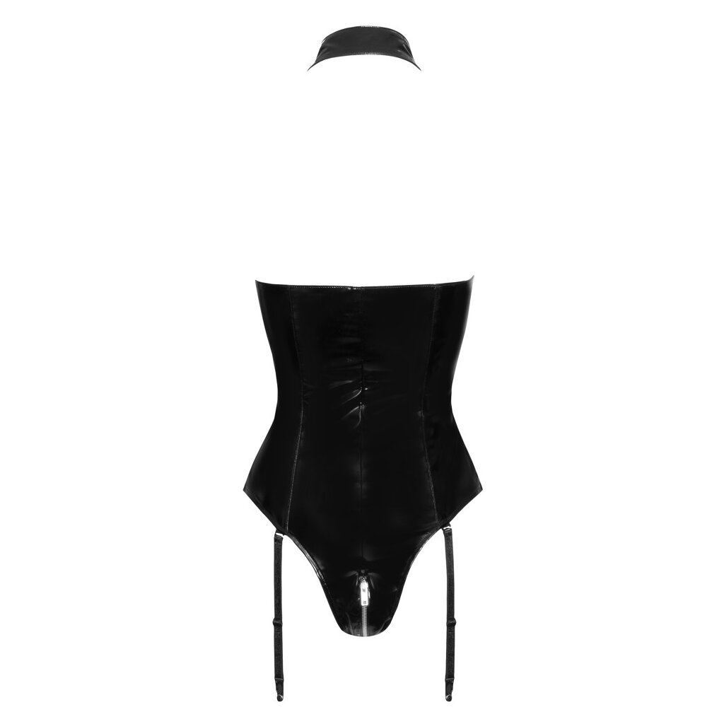Provocative bodysuit by Black Level completely in black patent shine with 4 adjustable and removable suspenders. The open front is closed with 3 buckles and the neckband halter with a buckle. In the crotch with 2-way zipper to open.