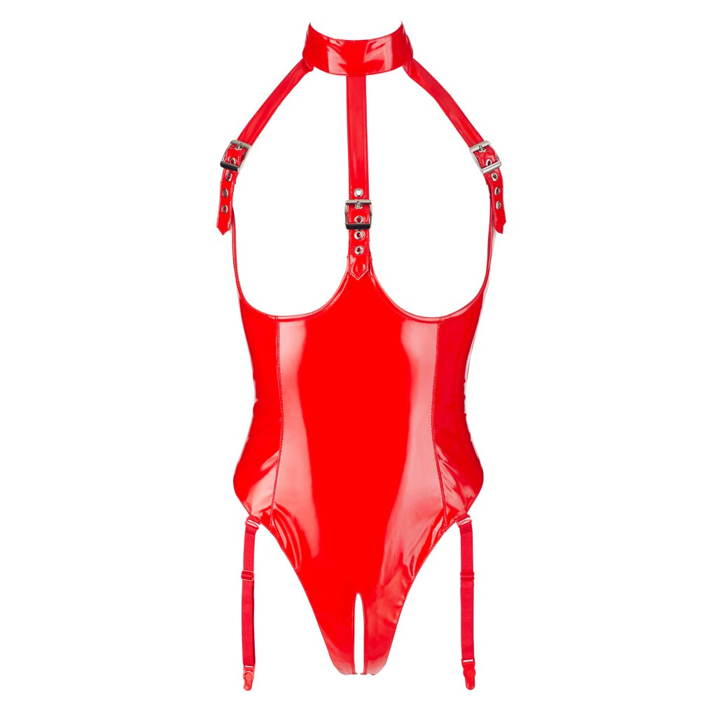 Bustless bodysuit by Black Level completely in fiery red patent shine. With inviting open crotch and adjustable and removable suspenders. Worked on underwire for optimal bust-free fit. 3 adjustable cleavage straps lead to the collar with snap fastener. In the back with practical zipper and push button.
