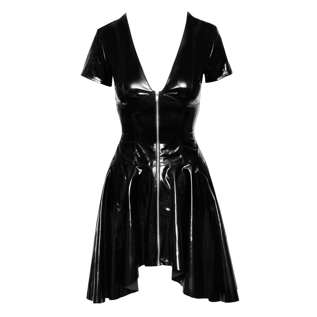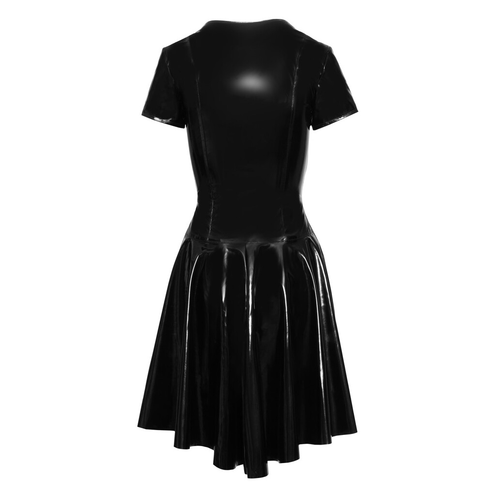 Robe à demi-manches de Black Level entièrement en verni noir brillant avec fermeture éclair métallique continue sur le devant. Coupe cintrée avec décolleté en V très profond. La jupe swing légèrement évasée est travaillée plus courte à l'avant et plus longue à l'arrière.