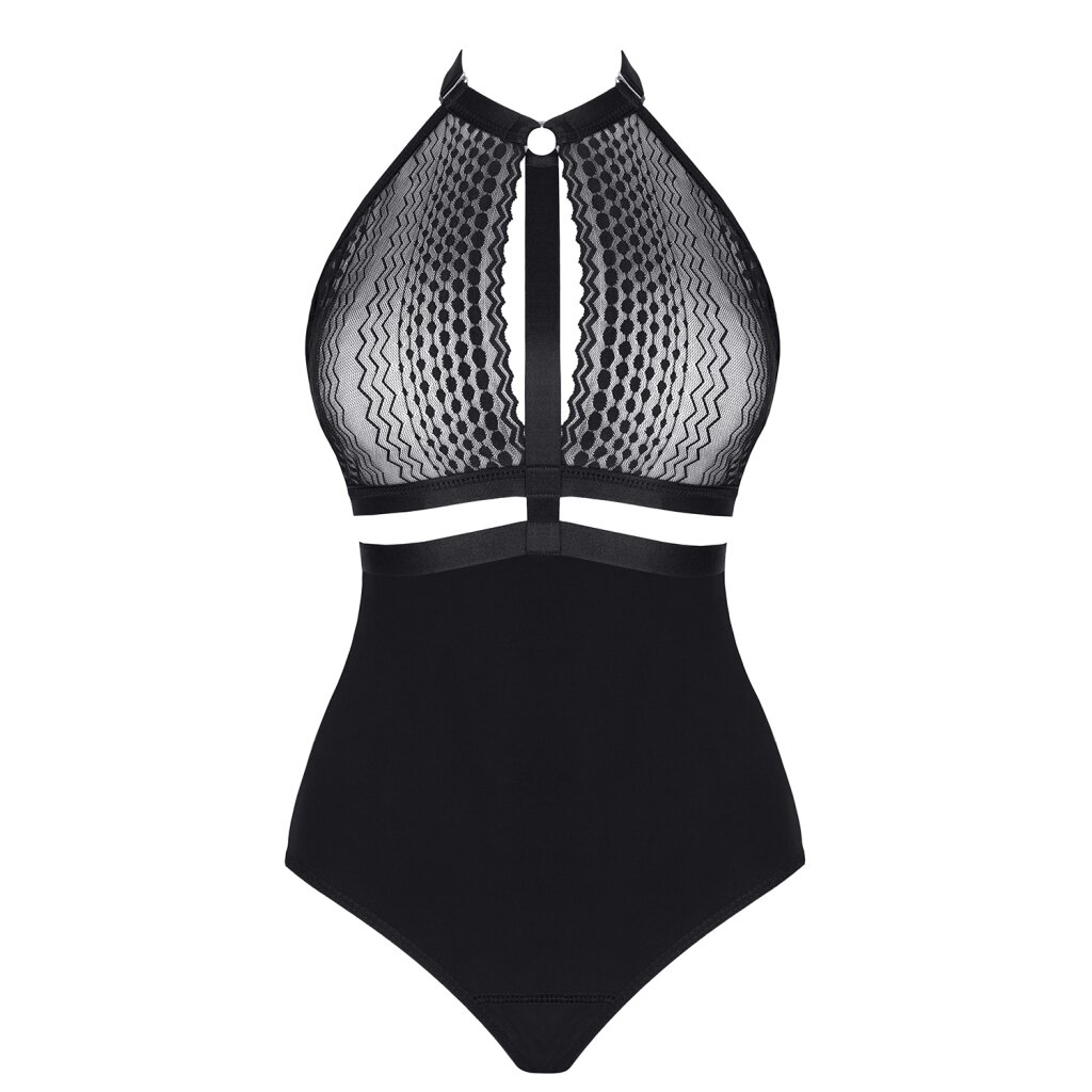 Sexy and comfortable body. The front cleavage is made of characteristic black lace in geometrical pattern. It goes beautifully with a composition of black elastic bands decorated with a silver colored, metal ring. At the back there is a silver colored, metal adjuster on the neck.