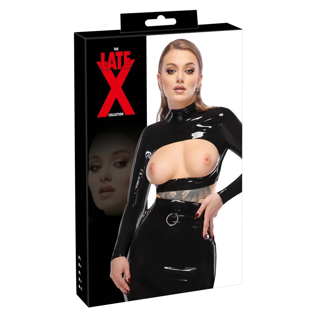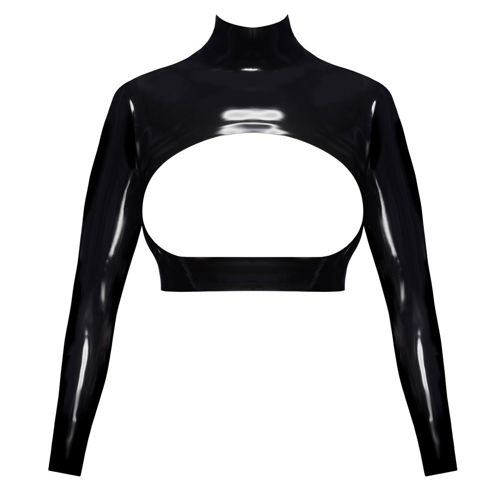 Crop top made of black natural latex (0.35 mm thick) with a large neckline at the front for a breathtaking view of your breasts. Stylishly elegant with a stand-up collar and long sleeves. Full-length zipper at the back for easy dressing and undressing.