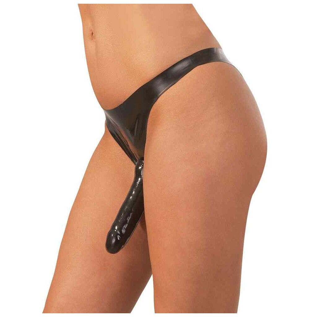 Profitez de sessions érotiques chaudes et pleines de stimulation vaporeuse avec ce slip classique en latex noir. Il y a un grand gode en latex réaliste solidement attaché au slip et deux godes à l'intérieur du slip pour le plaisir vaginal et anal !