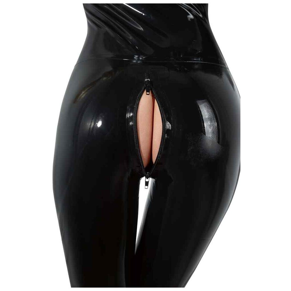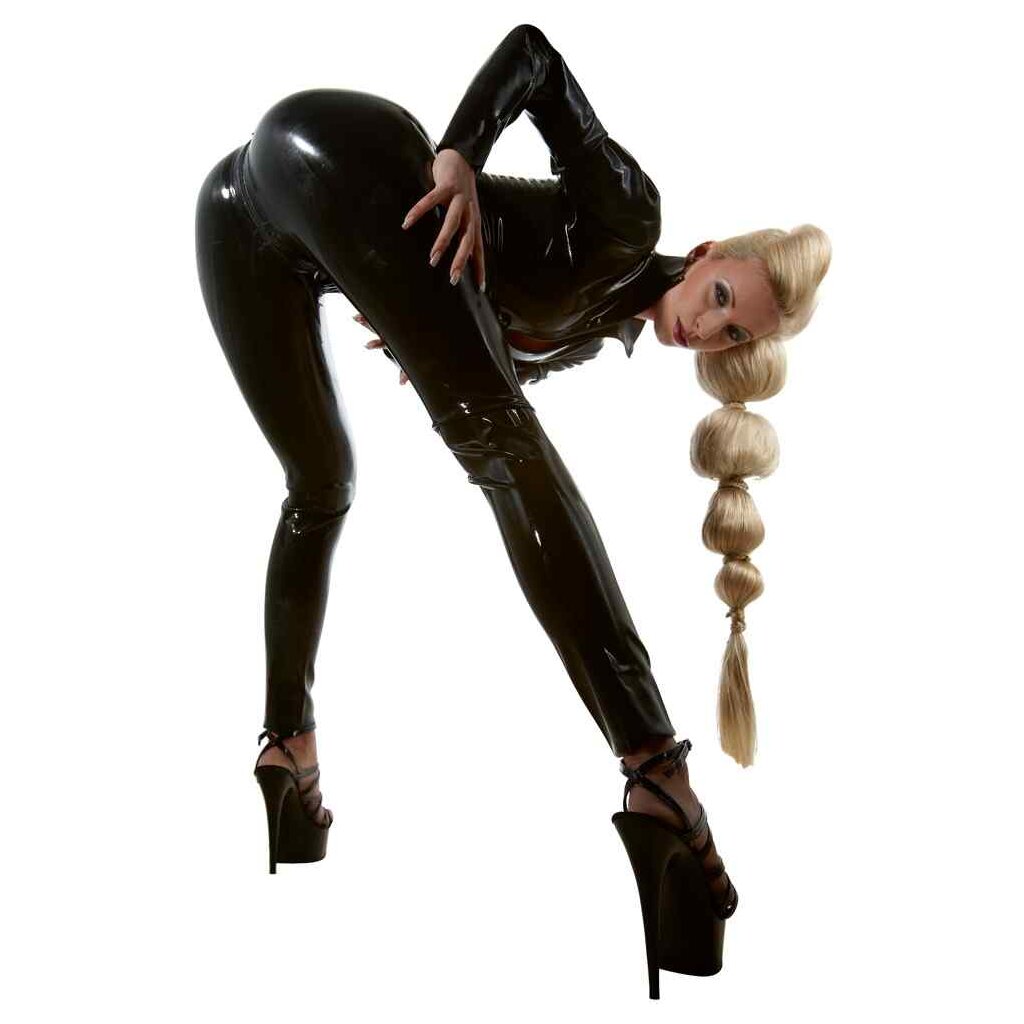 The catsuit with two zips! Slightly tapered, black catsuit with a stand-up collar. The 50 cm long zip at the front and the zip over the crotch can be opened to provide access to the beautiful body underneath. Latex, made from natural rubber latex which may cause allergies.