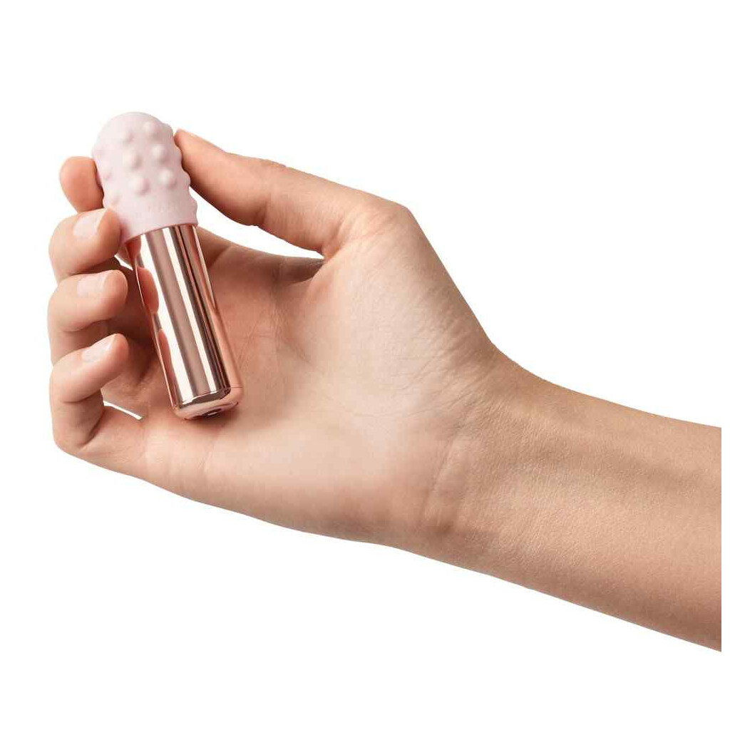 Metal mini vibrator with 2 silicone attachments that have 2 different textures. The stylish pleasure-giver has 15 diverse vibration modes. and a practical travel lock. It's perfect for travel and on the go. Includes a storage bag. It can be recharged with the included USB cable.