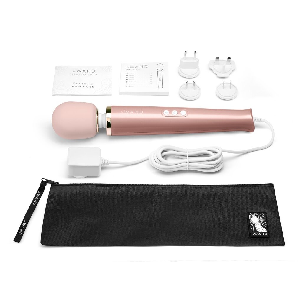 Le puissant masseur vibrant rechargeable est alimenté directement par son cordon d'alimentation extra-long. Quatre adaptateurs différents sont inclus, afin que le masseur puisse être utilisé dans le monde entier (par exemple en voyage). Un sac de rangement de haute qualité est également inclus.