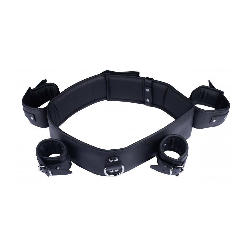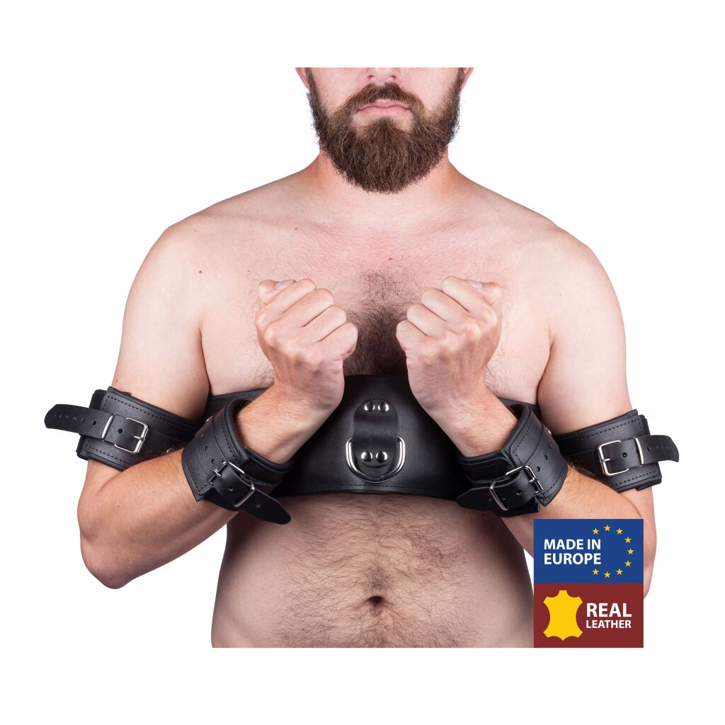 Mit diesem Hilfsmittel werden die Arme und Handgelenke an der Brust fixiert. Dadurch wird die Position des Partners unterwürfig. Mittelteil 10 cm, der um die Brust verläuft (Brustumfang 59 bis 74 cm). Umfang 39 bis 52 cm für die Arme. Umfang 20 bis 30 cm für die Handgelenke. Aus echtem Rindsleder. Gewicht: 980 g / Breite: 15.0 cm / Tiefe: 15.0 cm / Höhe: 65.0 cm