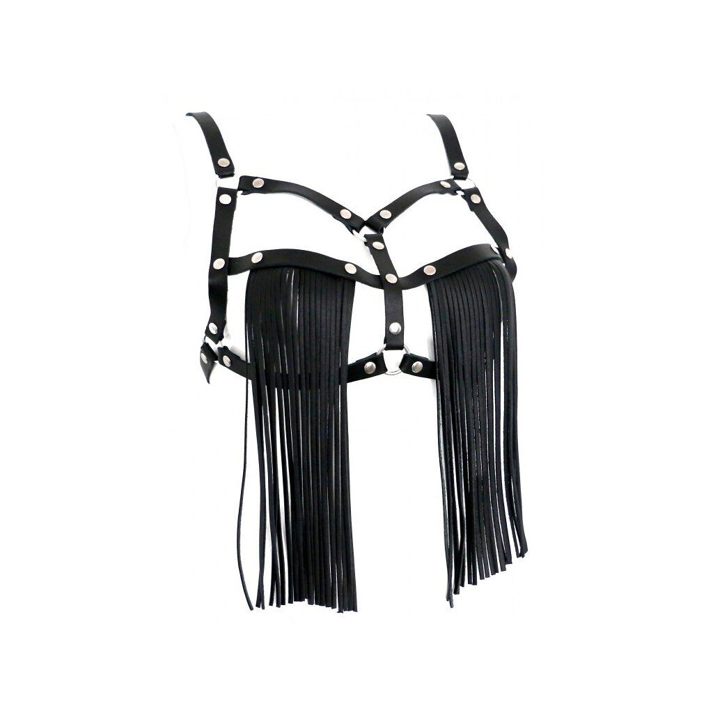 Dieses Sm-Accessoire ist ein BH mit Fransen. Er wird von der Marke The Red angeboten. Er ermöglicht es, die Brüste zu bedecken und einen Sexy-Stil zu verleihen. Die Riemen sind 1,5 cm breit und die Fransen sind 25 cm lang. Dieses Accessoire passt sich perfekt an alle Brustgrößen an. Anpassung im Rückenbereich. Hergestellt aus echtem Rindsleder.