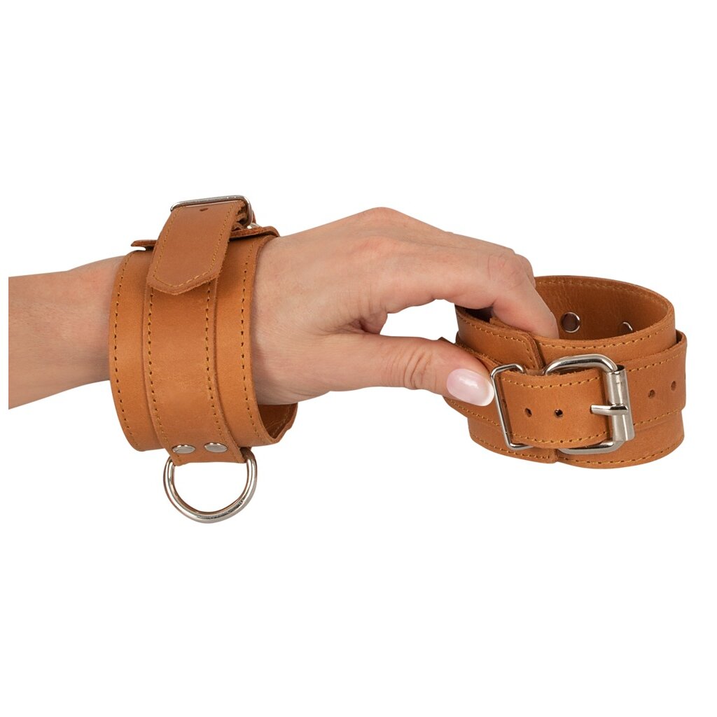 Stabile, hochwertige Handfesseln von ZADO aus glattem Leder in typischer Naturoptik mit silberfarbenen Metalldetails und D-Ringen. Doppellagig gearbeitet für hohen Tragekomfort mit schmal eingefassten genähten Kanten. Das naturbelassene Leder ist nicht gefärbt/gewachst und kann mit der Zeit eine schöne Patina entwickeln