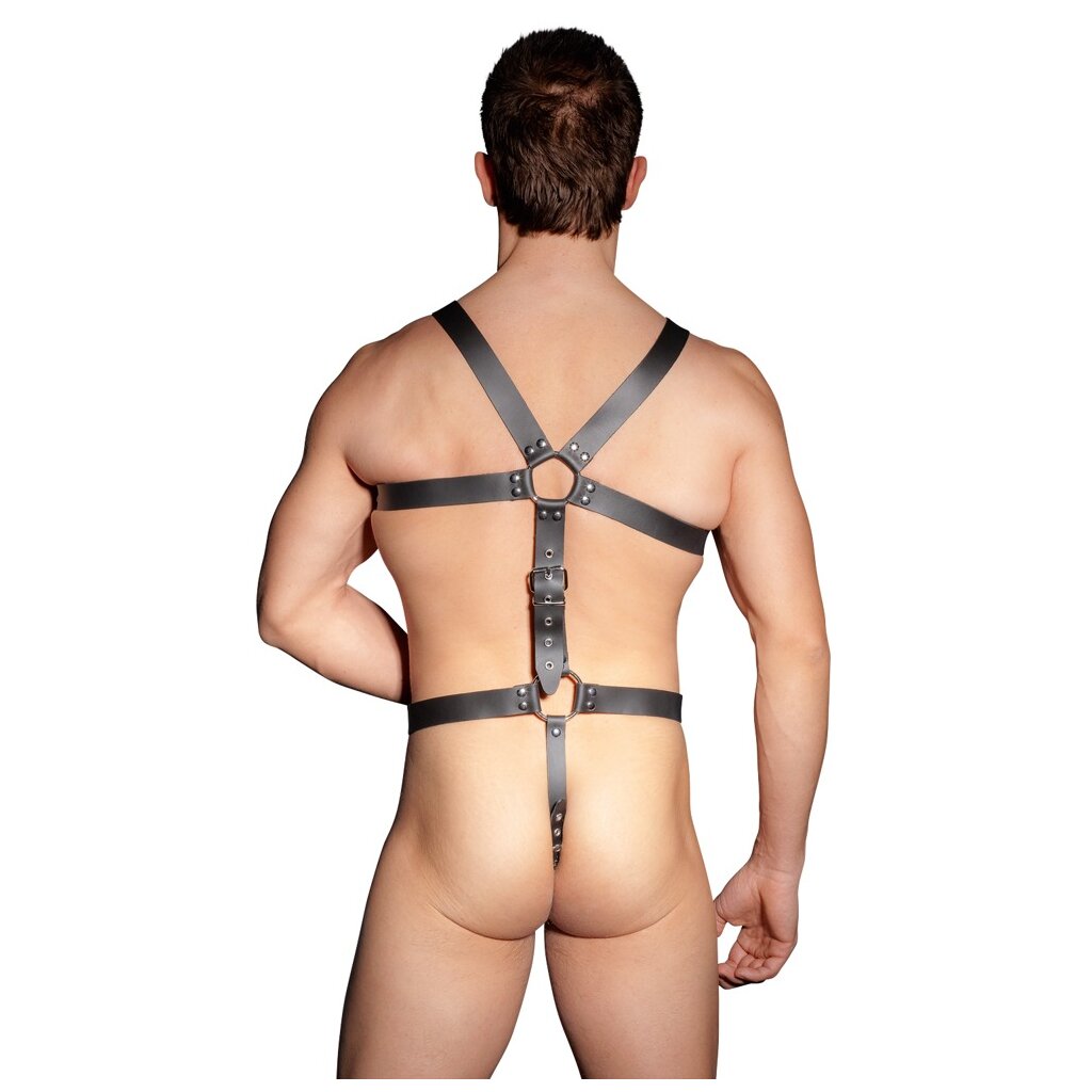 For leather lovers! Harness made out of black, studded, leather straps and steel connection rings. It can be adjusted thanks to the buckle fasteners. The cock/ball ring (Ø 5 cm) keeps IT under control. High-quality, durable quality.