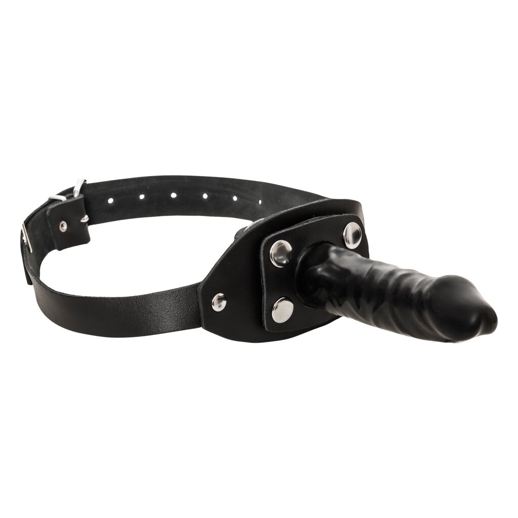Bâillon ZADO avec sangle réglable en cuir noir et gode extérieur amovible (boutons-pression). Gode et bâillon en latex et en optique de pénis avec gland moulé.