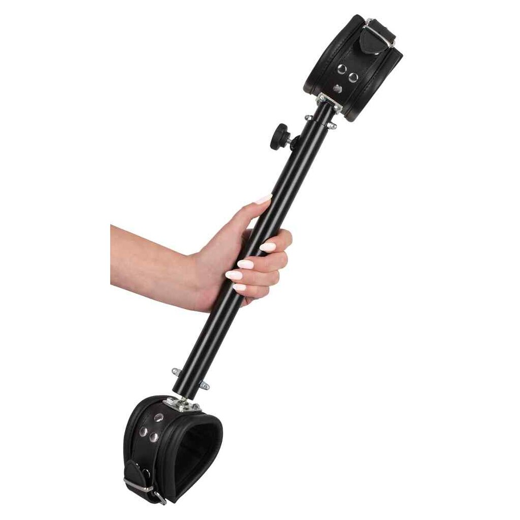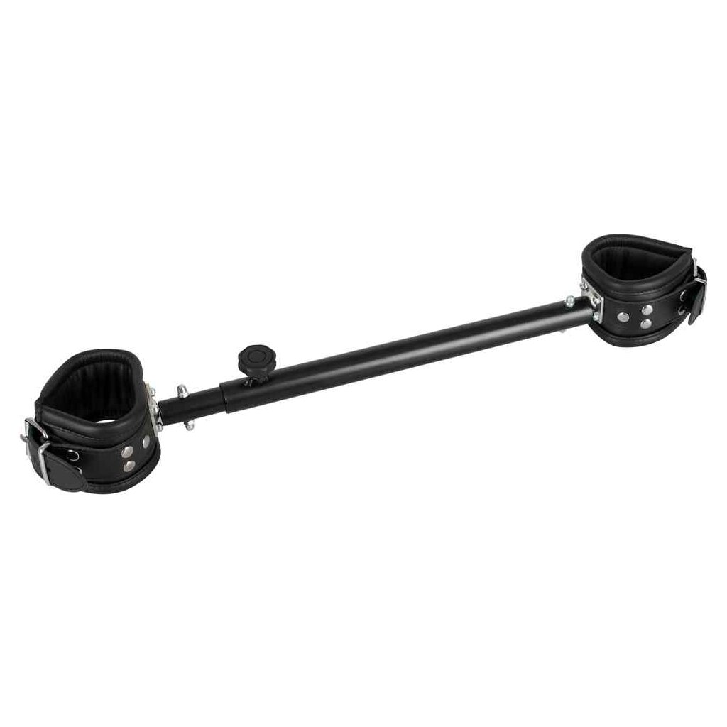 Securely assembled softly padded leather ankle cuffs on an adjustable metal bar (extendible from 35 to 60 cm). The cuffs can be adjusted with the buckle fasteners. Black. Leather (nappa and split leather), metal.
