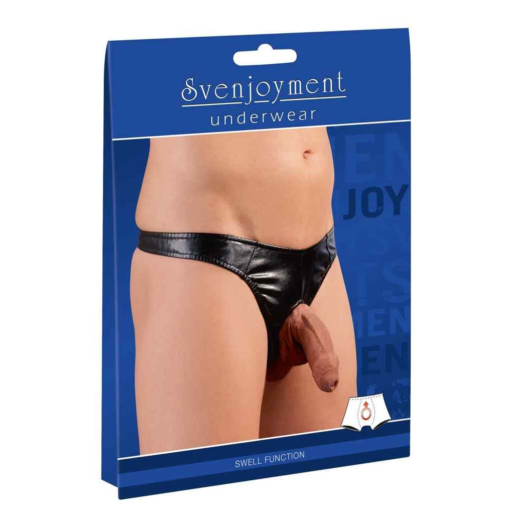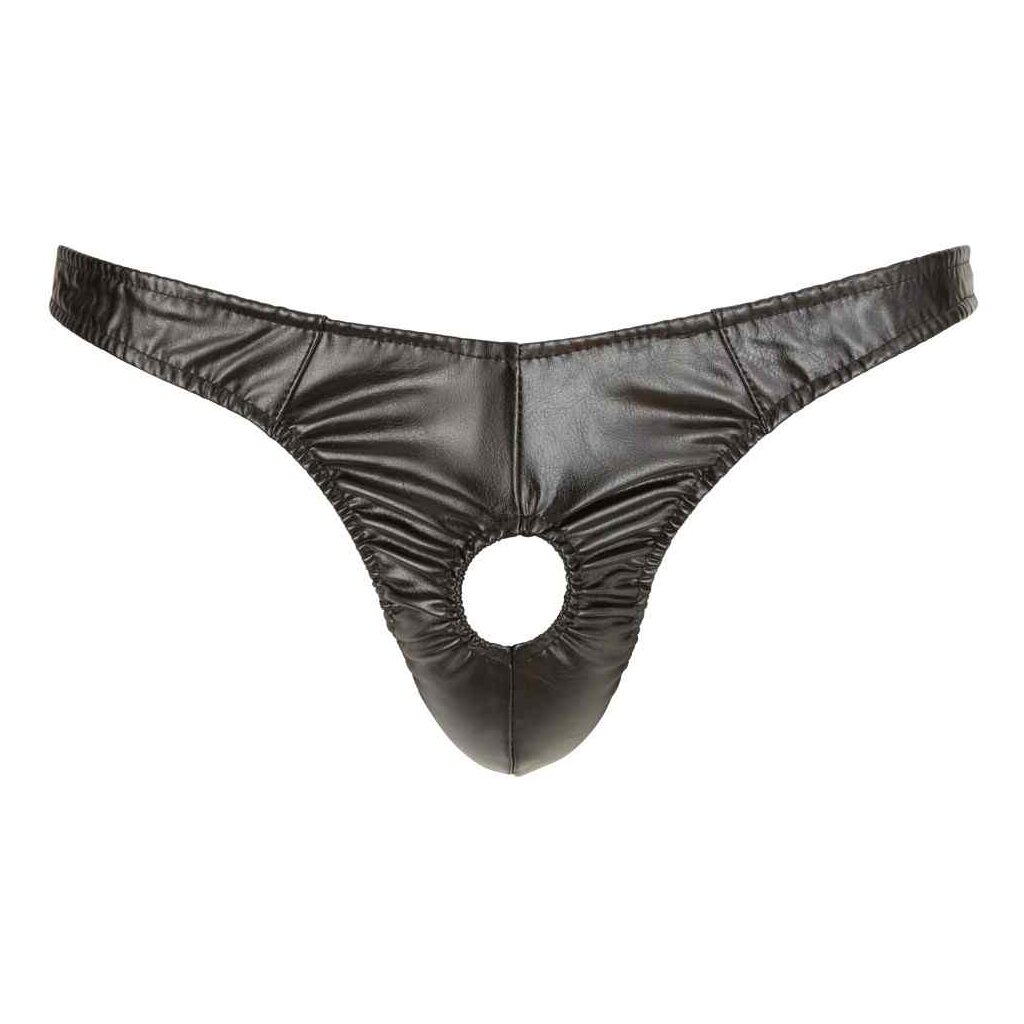 For your big entrance! Shiny black imitation leather string with a flexible front hole. The penis and testicles are pushed through this hole, so that you can show off what you´ve got! 98% polyester, 2% spandex with a polyurethane coating.