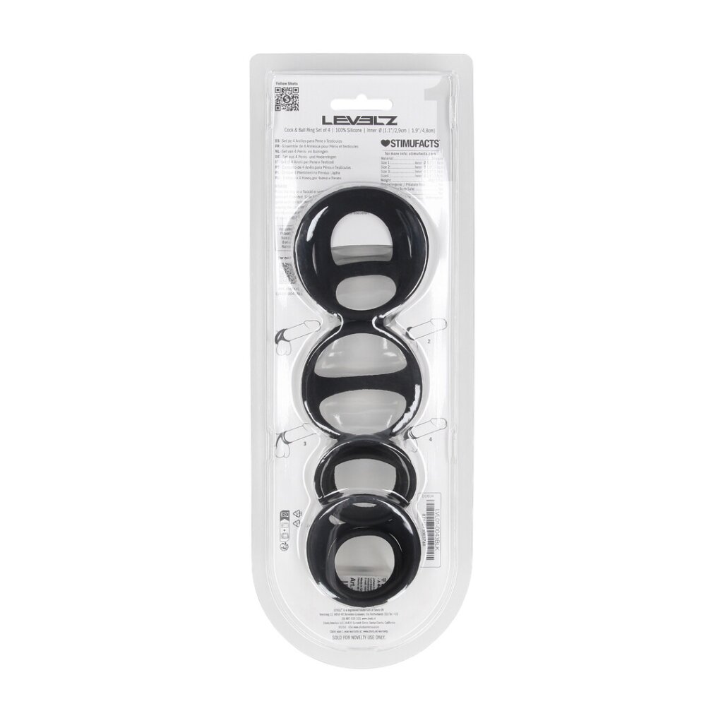 The silicone cock and ball ring set from the LEVELZ collection includes four uniquely shaped rings, each offering a different fit, pressure point, and visual style. This variety allows users to explore multiple sensations and find their preferred grip.