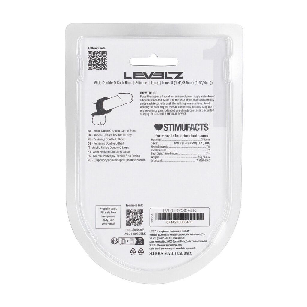The Wide Double O silicone cock ring from the LEVELZ collection is designed for users who want enhanced control with a more spacious fit. The wide dual-loop design allows for simultaneous shaft and ball wear, providing balanced and supportive pressure.