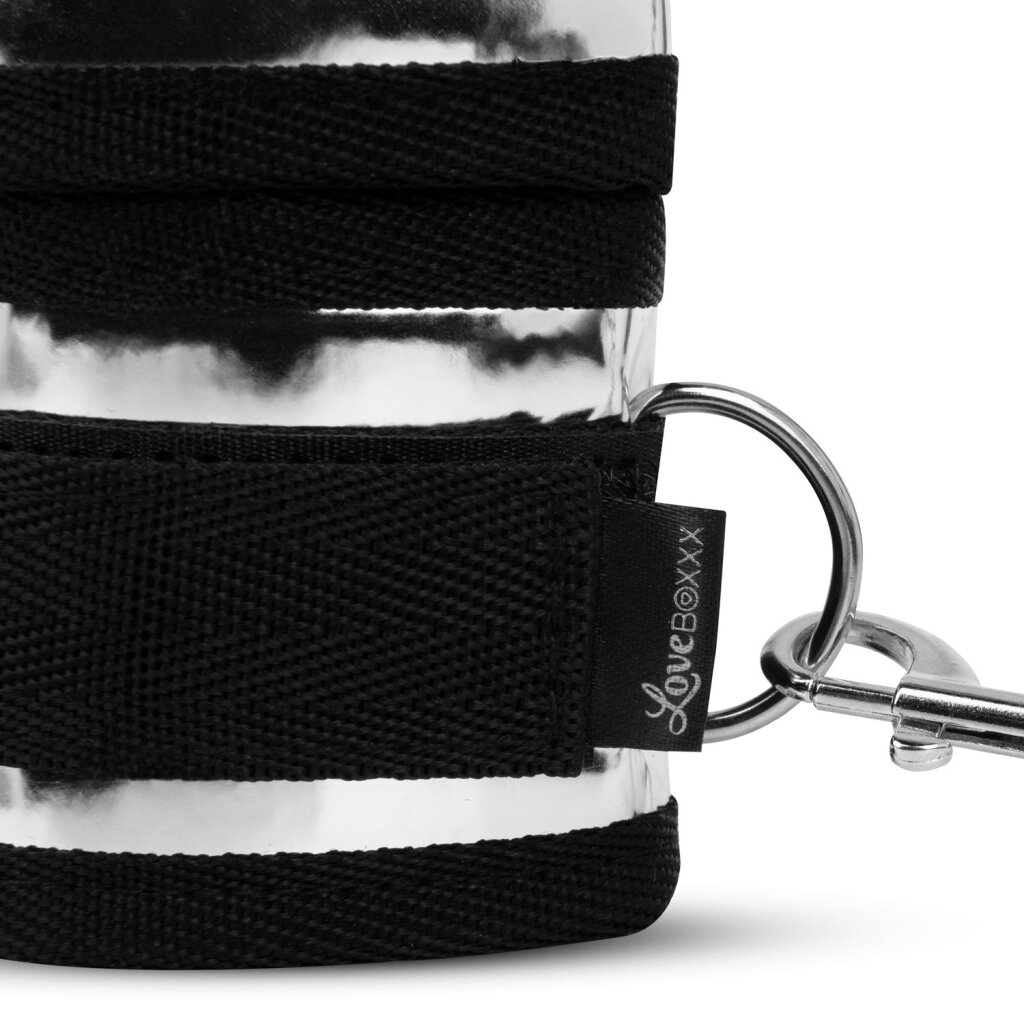Dieses luxuriöse All-in-One-Set enthält eine glänzende silberne Maske, elegante Handschellen, passende Fußfesseln sowie vier vielseitige Bettfesseln, die einfach unter die Matratze gelegt werden können.