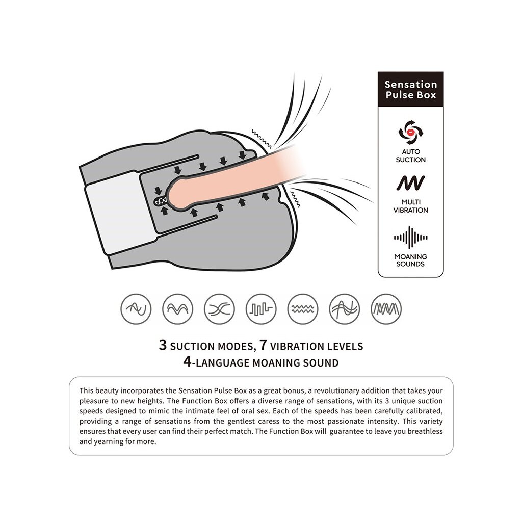 Mit der Integration realistischer Stöhngeräusche und 7 Vibrationsfrequenzen geht die Sensation Pulse Box noch einen Schritt weiter, um ein wahrhaft umwerfendes Erlebnis zu gewährleisten, das bei jeder hautfreundlichen Erfahrung unwiderstehliche Lust erzeugt.
