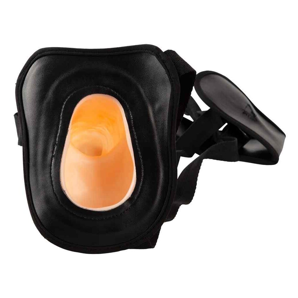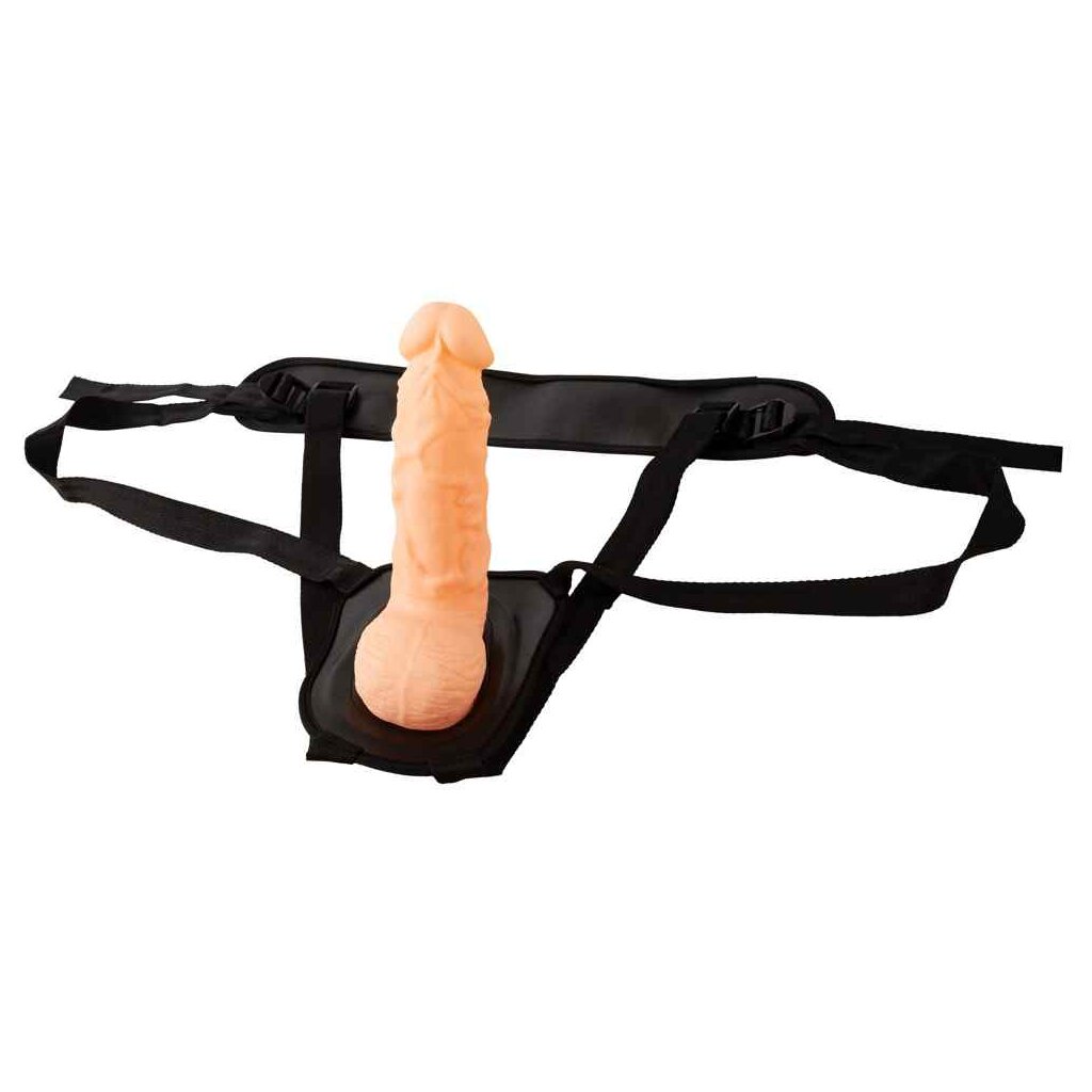 This set features a hollow dildo and a strap-on harness that is comfortable to wear with wide straps. Because the dildo and its scrotum are hollow, men can insert their penis and balls, but its sturdy enough to be used by people without penises too. The realistic dildo shaft has raised veins for added stimulation and a prominent glans. The comfortable harness has wide adjustable straps to accommodate most waist sizes Made of ABS plastic, PU and Polyester.
