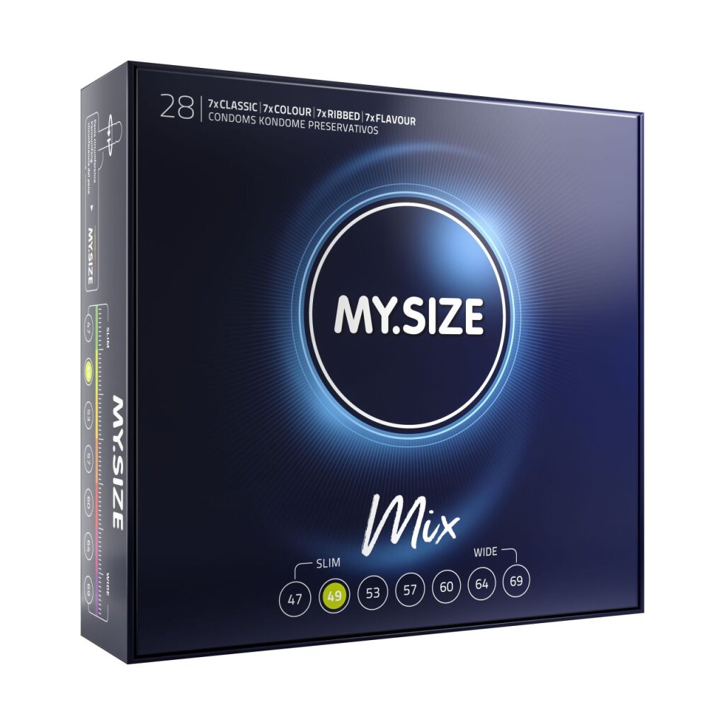 28 préservatifs en latex de caoutchouc naturel avec réservoir, cylindriques, humides. 7 de chaque : couleur naturelle, lisse ; couleur naturelle, strié ; rouge avec goût de fraise ; bleu Largeur nominale : 49 mm.