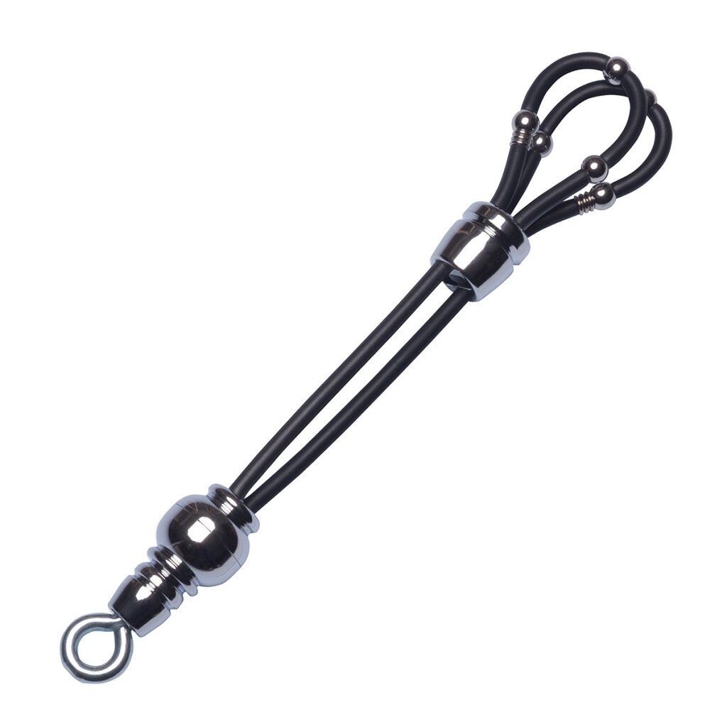 Ziehen Sie die obere Hülse nach unten und halten Sie die gerippten Ringe mit zwei Fingern fest, dann ziehen Sie die Schlaufen nach oben. Führen Sie den steifen Penis durch die Schlaufen und ziehen Sie die Manschette nur so fest an, dass kein Schmerz entsteht. Wenn Sie zu viel Druck spüren oder der Penis blau anschwillt, ziehen Sie die Rippenringe mit der Schlaufe einfach nach links und rechts hoch. Dann legen Sie die Hodenschlaufe über den Hoden und ziehen die untere Manschette mit Gefühl nach oben.