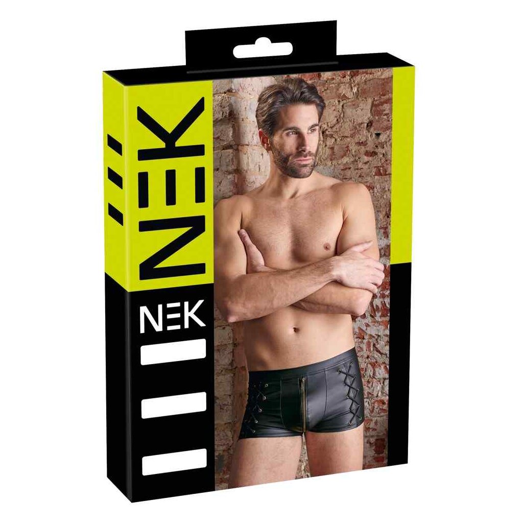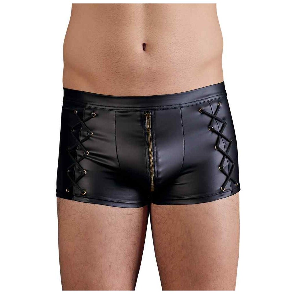 Look masculin mat distinctif! Pantalon noir délicat avec une fermeture éclair en laiton rembourrée à l'avant. Avec un laçage frappant sur les côtés. Ajustement serré et élastique pour un ajustement parfait.