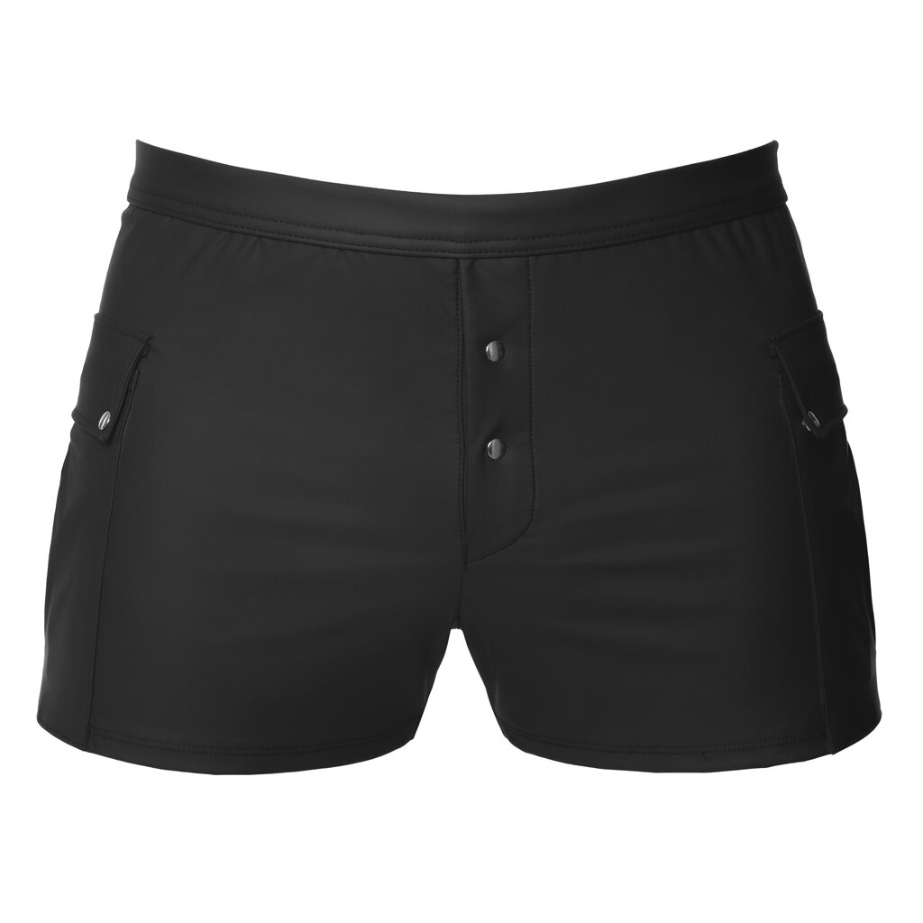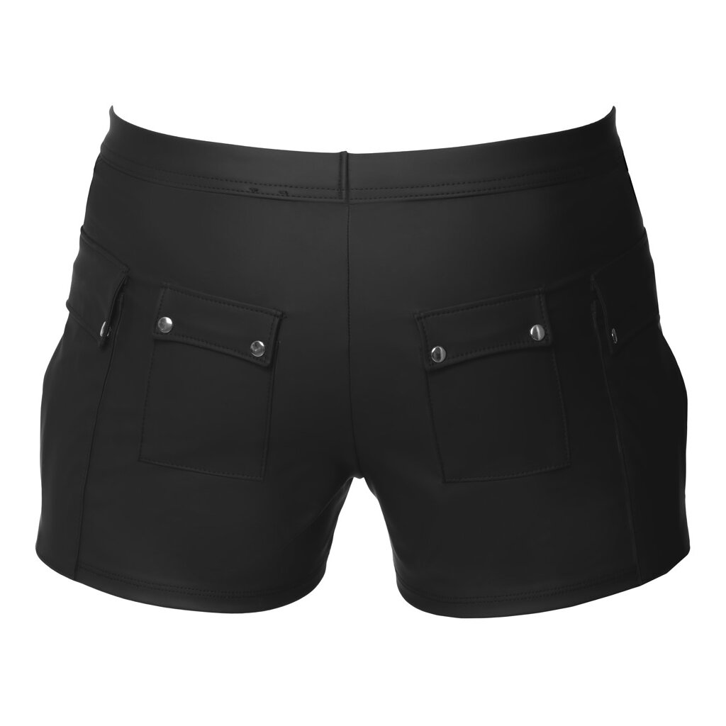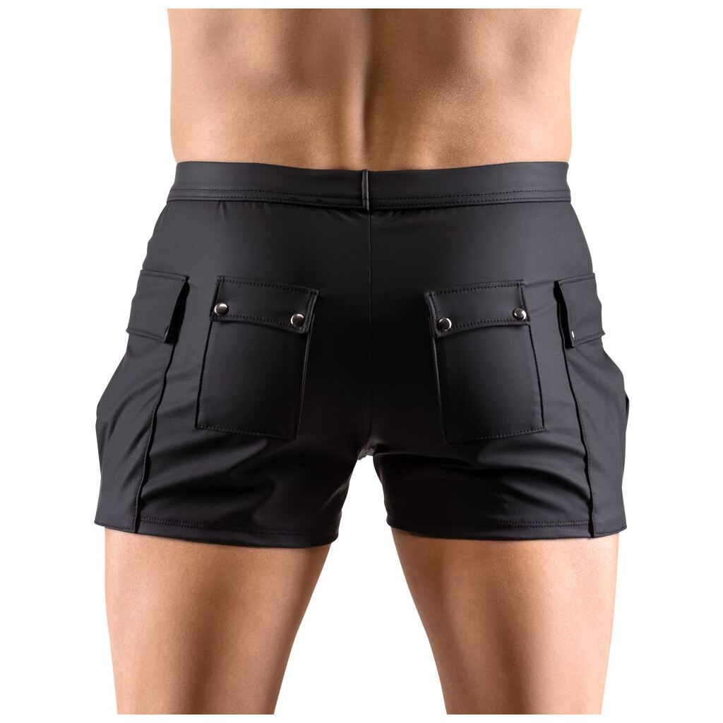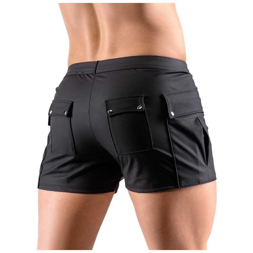 Black, loose-fitting shorts by Svenjoyment made of lightweight stretch material with trendy matte finish. In worker style with snap front, as well as 2 large pockets on the side and 2 patch pockets on the bottom - all pockets with snap flap.