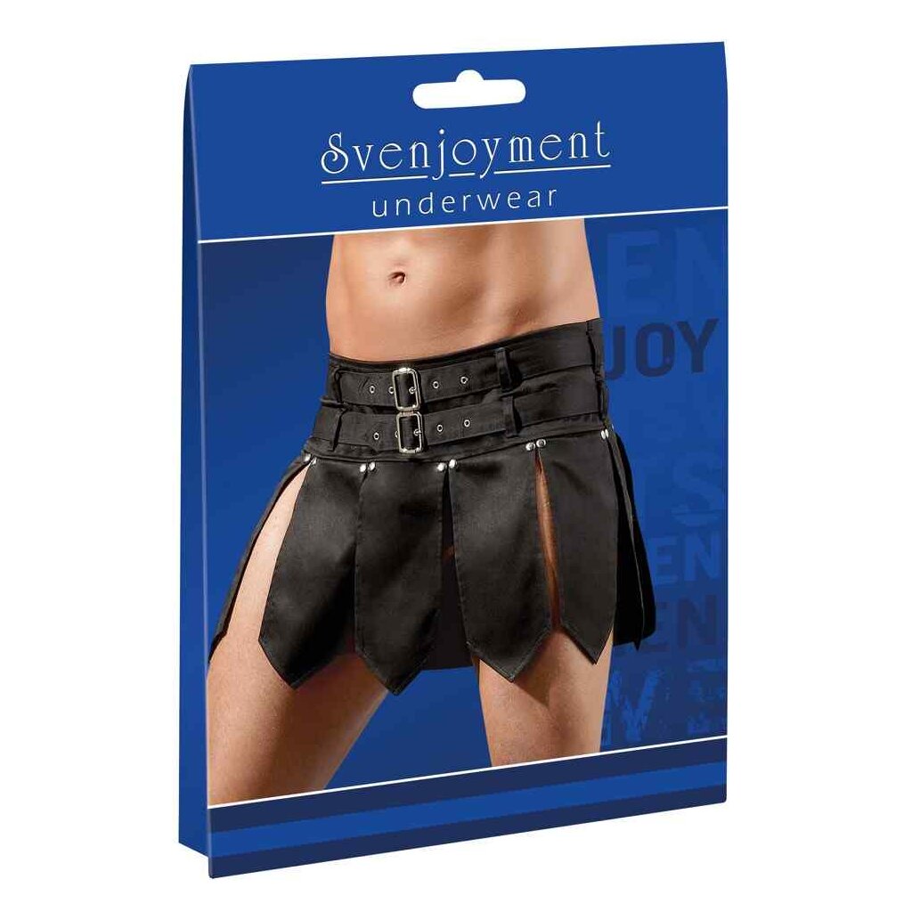 Jupe noire de style gladiateur avec deux ceintures. Elle est extensible à l'arrière. 60% polyester, 35 otton, 5% spandex.