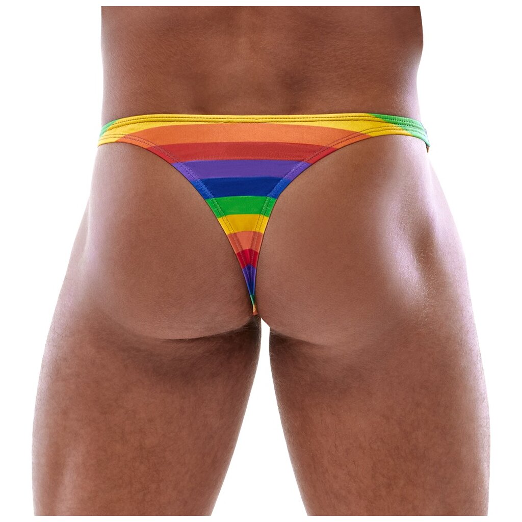 So bunt wie die Liebe! Riostring von Svenjoyment mit bunten Streifen in Regenbogenfarben. Rundum weich und elastisch für höchsten Tragekomfort und uneingeschränkte Bewegungsfreiheit. Größe XL / Materialzusammensetzung: 90% Polyester, 10% Elasthan