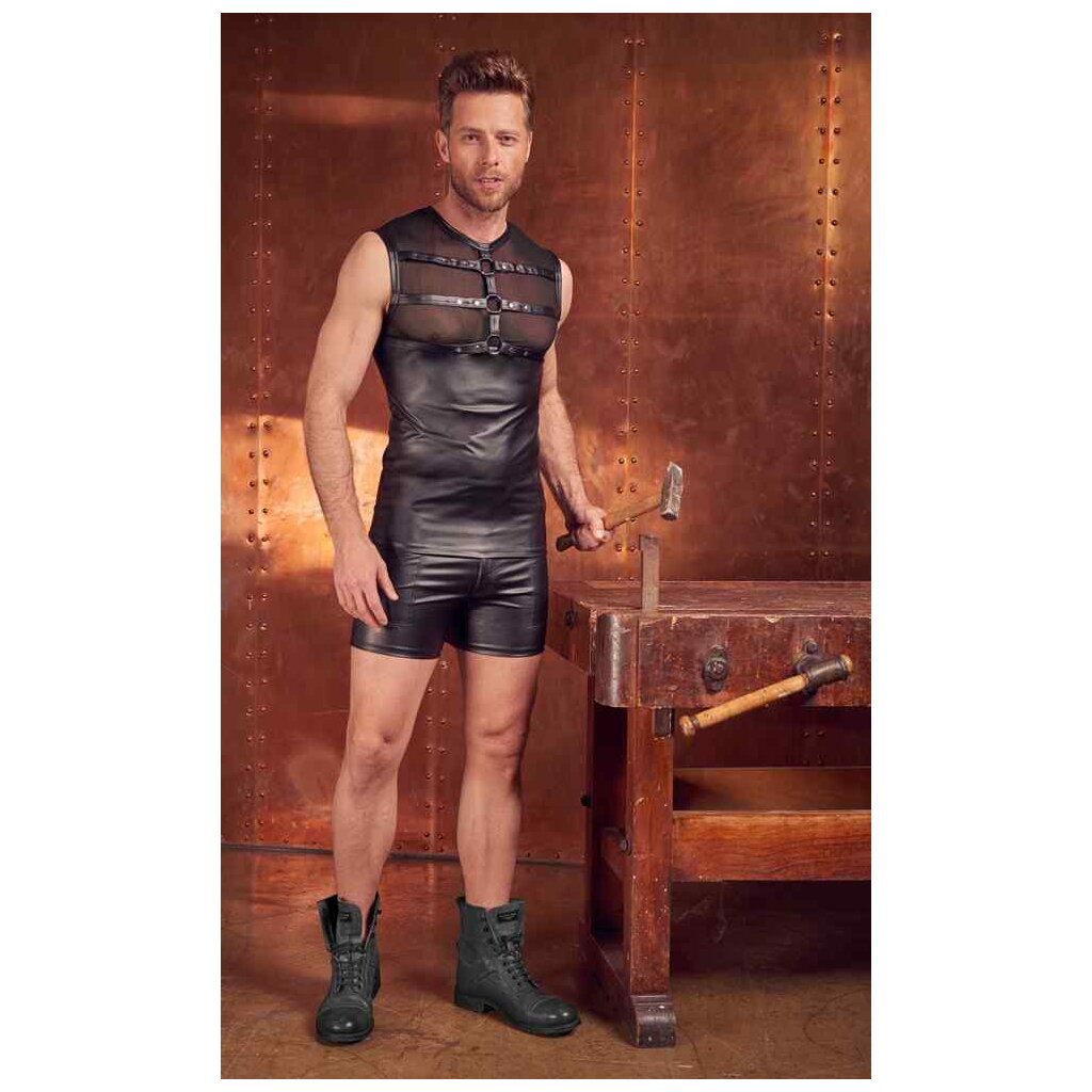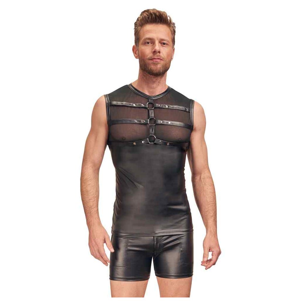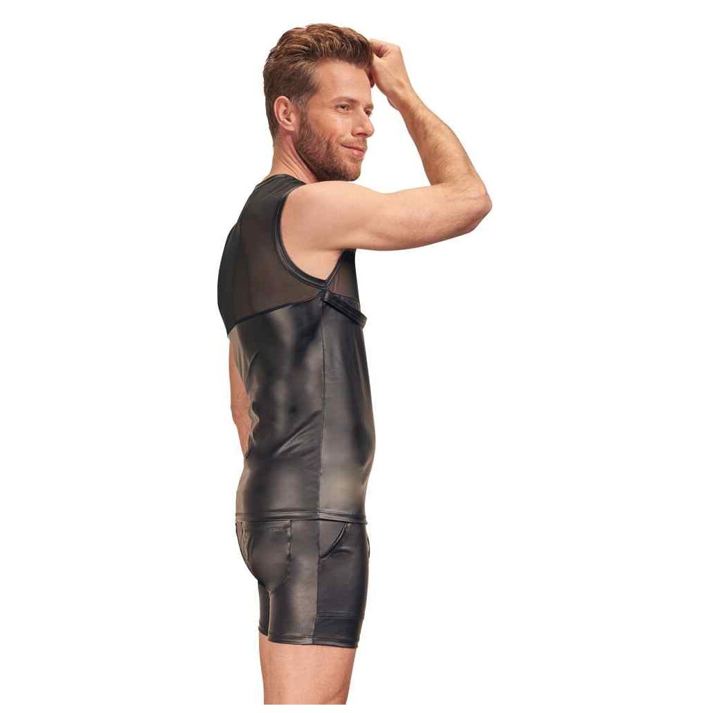 Top de NEK en matière tendance d'aspect mat. La partie supérieure est faite de powernet doux et extensible et il y a un harnais cousu sur le powernet à l'avant. L'arrière du haut est également divisé en deux parties : powernet transparent en haut et matériau d'aspect mat en bas.