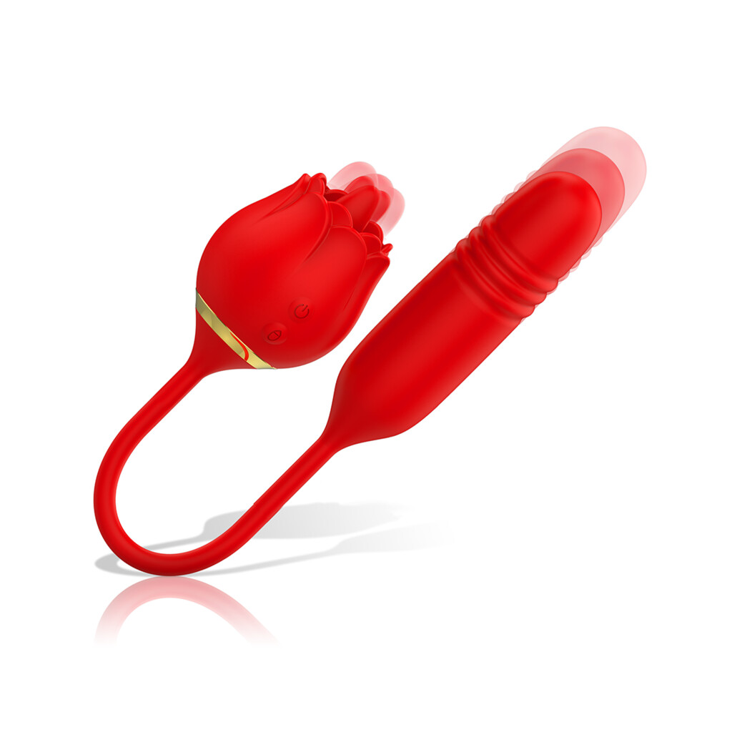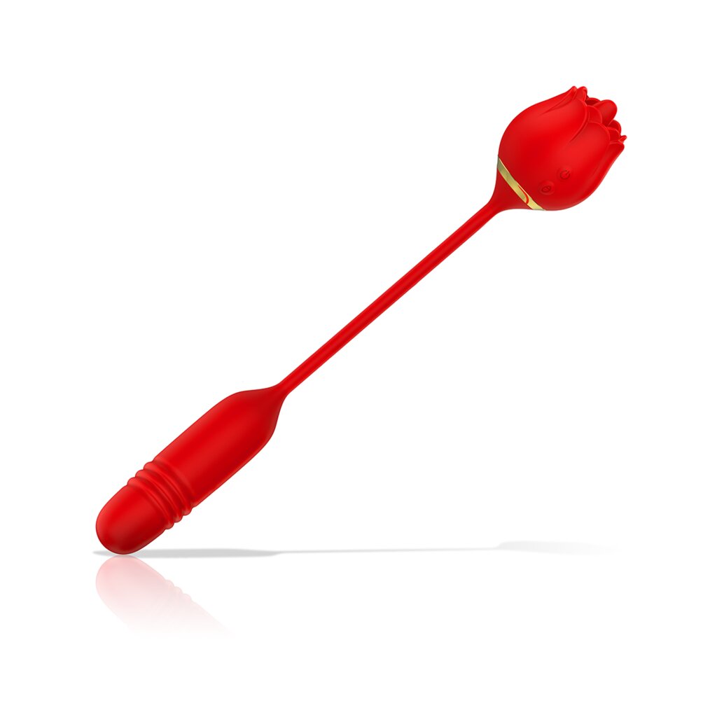 Rise to the top! The MIA DOOBLE PLEASURE LICKING ? The rose-shaped vibrator with a very cheeky tip that conquers all peaks. With the rounded tip of the 100% silicone stimulator, the circulating vibrations and a total of 10 vibration combinations, you can pamper all your erogenous zones such as the clitoris, labia or nipples, even on the go! This top vibrator can also be discreetly transported when traveling and always impresses with its absolute versatility.