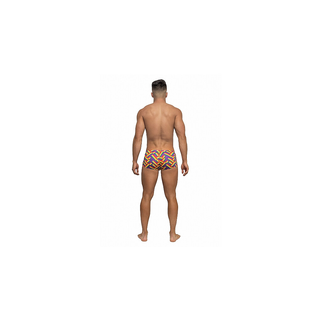 This model from Male Power's Pride Fest collection includes: A low-waist, high-cut leg mini short with a comfortable pocket and full back coverage. Multi-coloured festive rainbow print in a herringbone pattern. Stretchy and breathable lightweight polyspandex. Size S / Material composition: 85% polyester 15% elastane