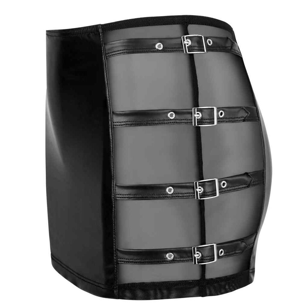 Show off what you've got – this will be really easy with this black mini skirt because it emphasises your sexy curves and shows off a lot of naked skin. The skin-tight skirt clings to your bum and the transparent net inserts at the sides are extremely eye-catching because they have small straps with buckles over them…